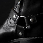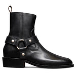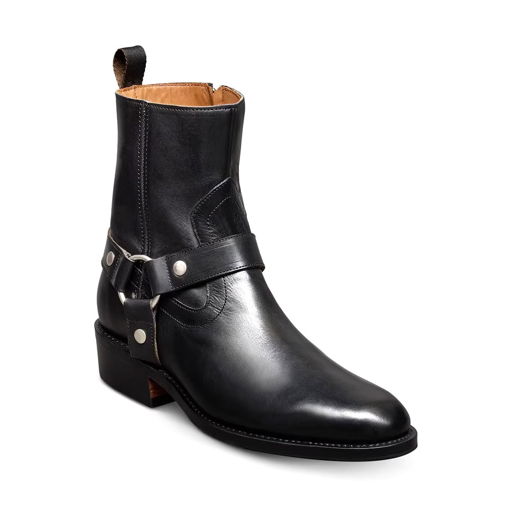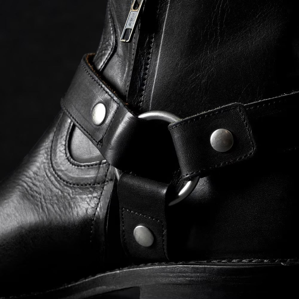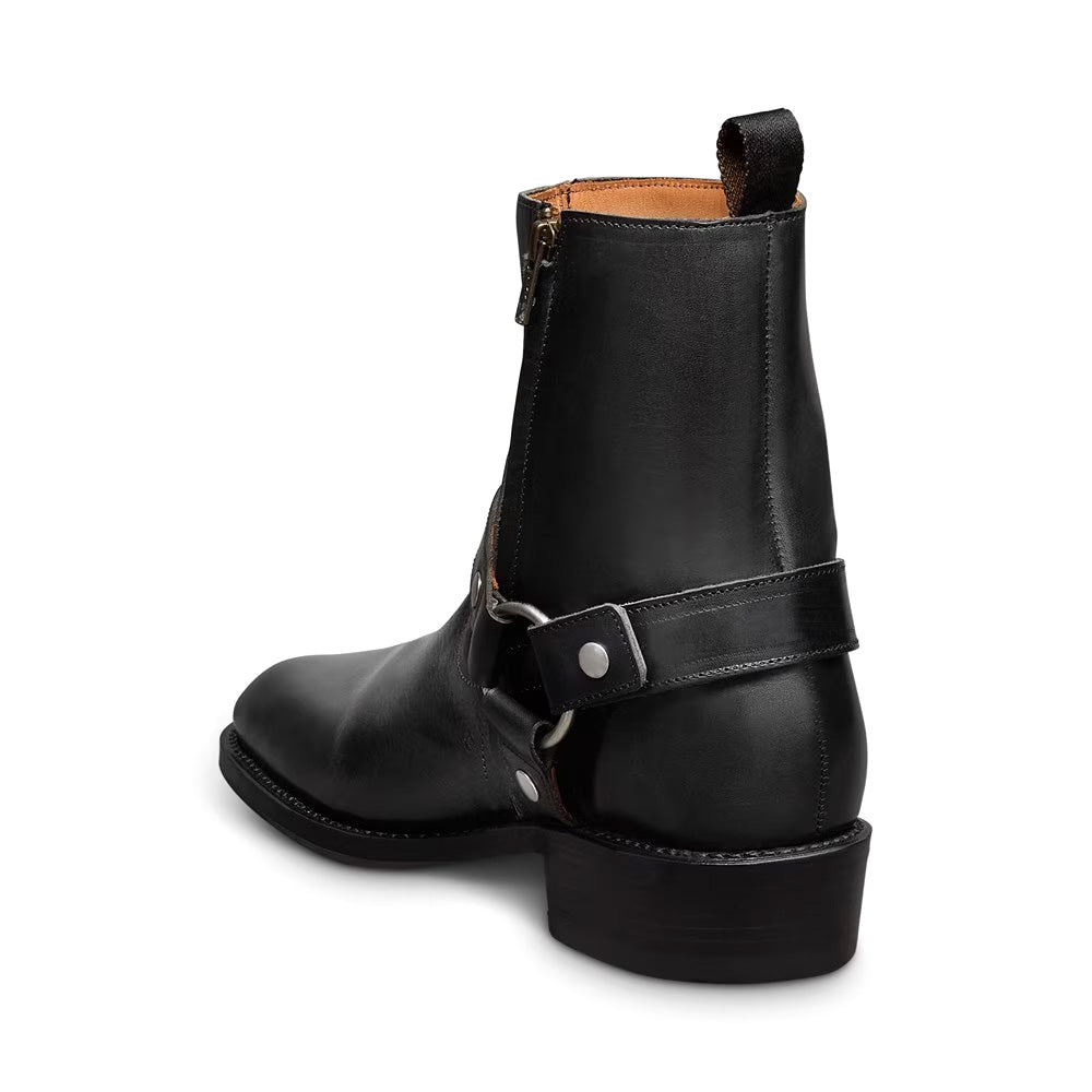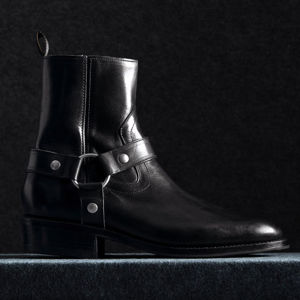 The Harness Boot is a modern take on a post-WWII classic—born from motorcycle gear and redefined through rock-and-roll style. Updated with a rounded toe, angled western heel, and a convenient side-zip with removable strap, it blends rugged heritage with refined design.