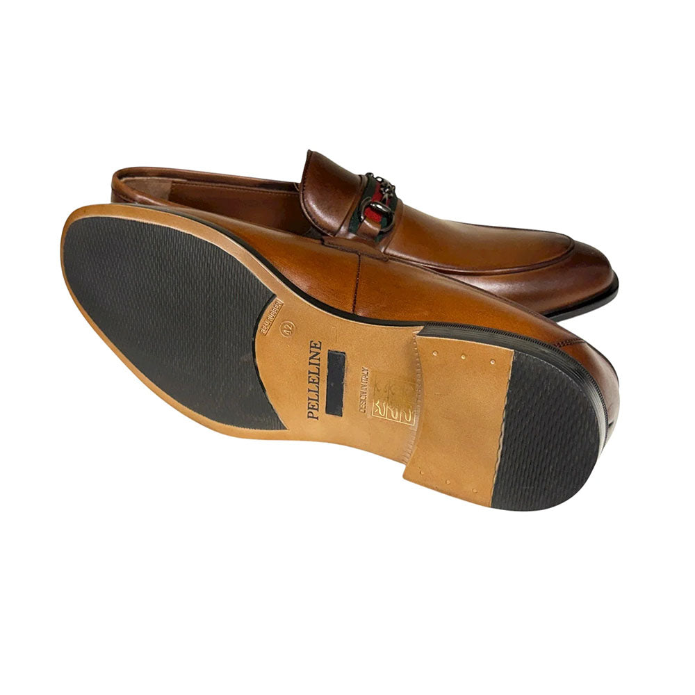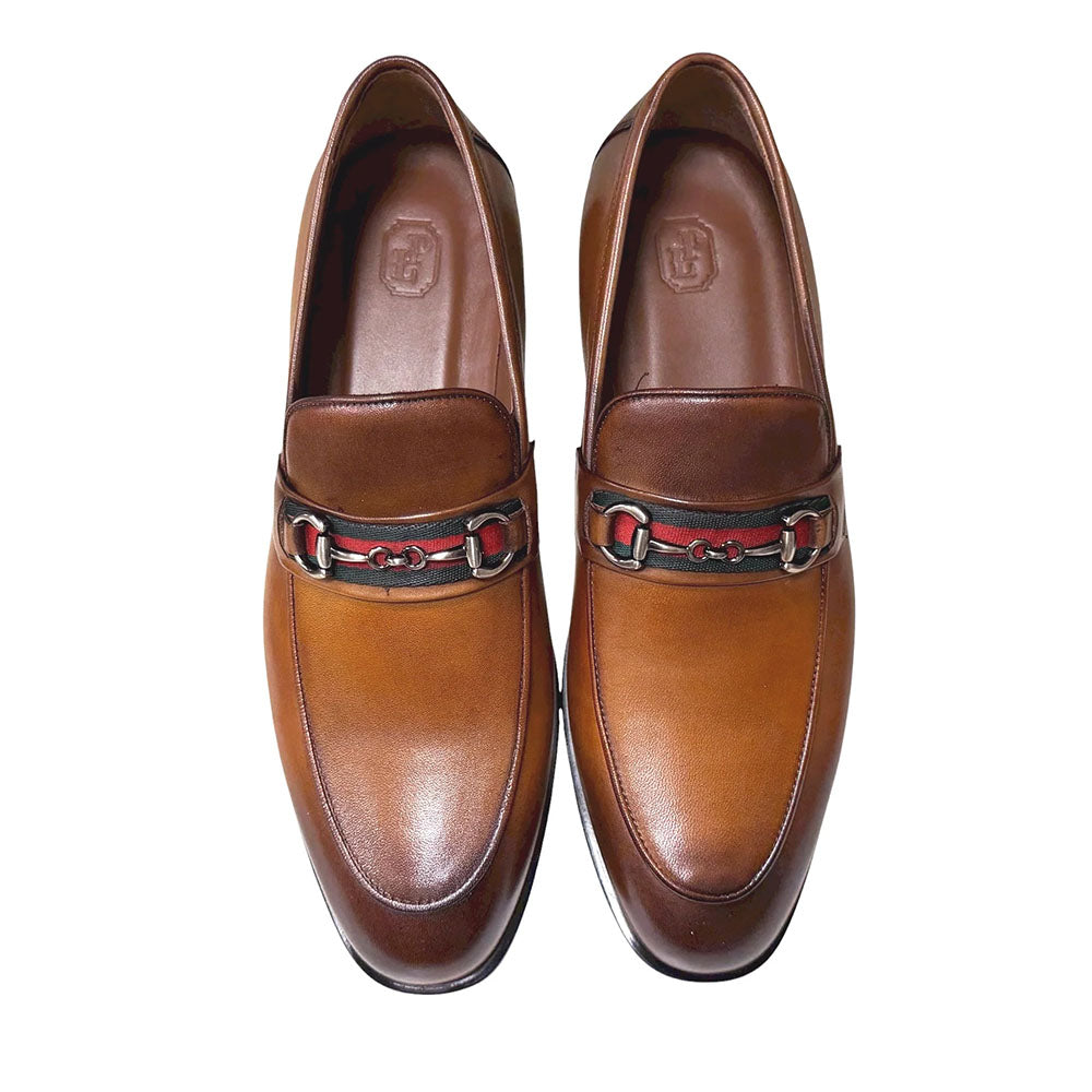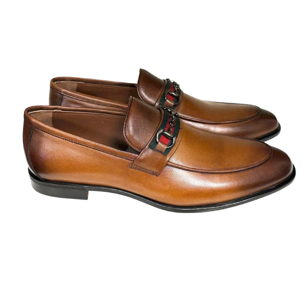 The Borris Buckle Loafer blends timeless style with refined craftsmanship. Hand-burnished tan leather gains character with wear, complemented by a green and red stripe and polished buckle. Effortlessly versatile, it transitions from business casual to weekend wear with understated luxury.