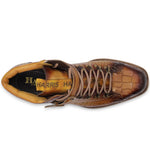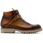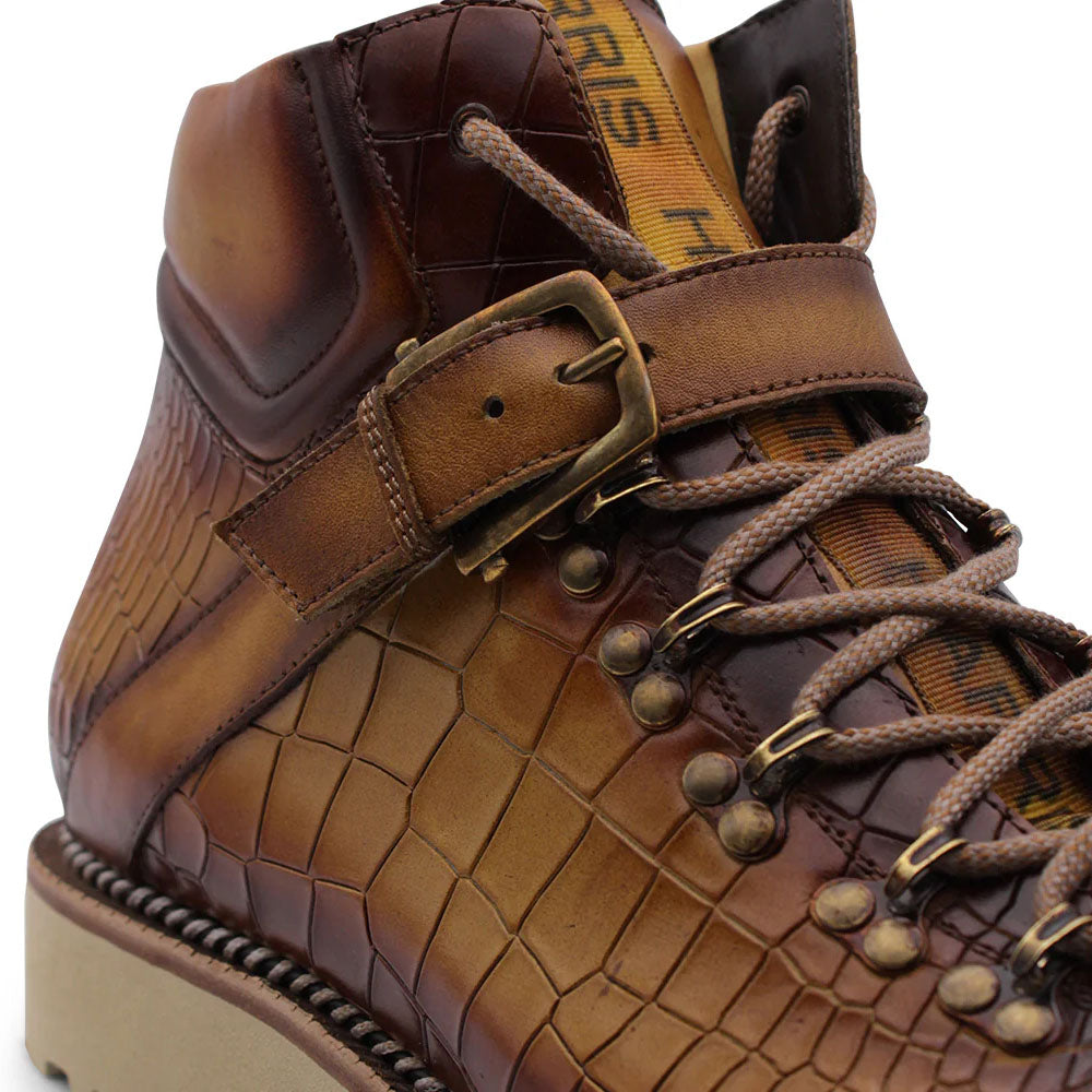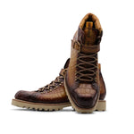 Mountaineering-style ankle boot in full-grain calf leather embossed with a crocodile effect, hand-painted and enriched with antiqued details. The closure features antique-gold eyelets and hooks, a leather lace with a matching buckle, and a taupe lug sole that adds a distinctly technical yet sophisticated character. Norwegian construction provides a robust build and an elevated, crafted aesthetic.