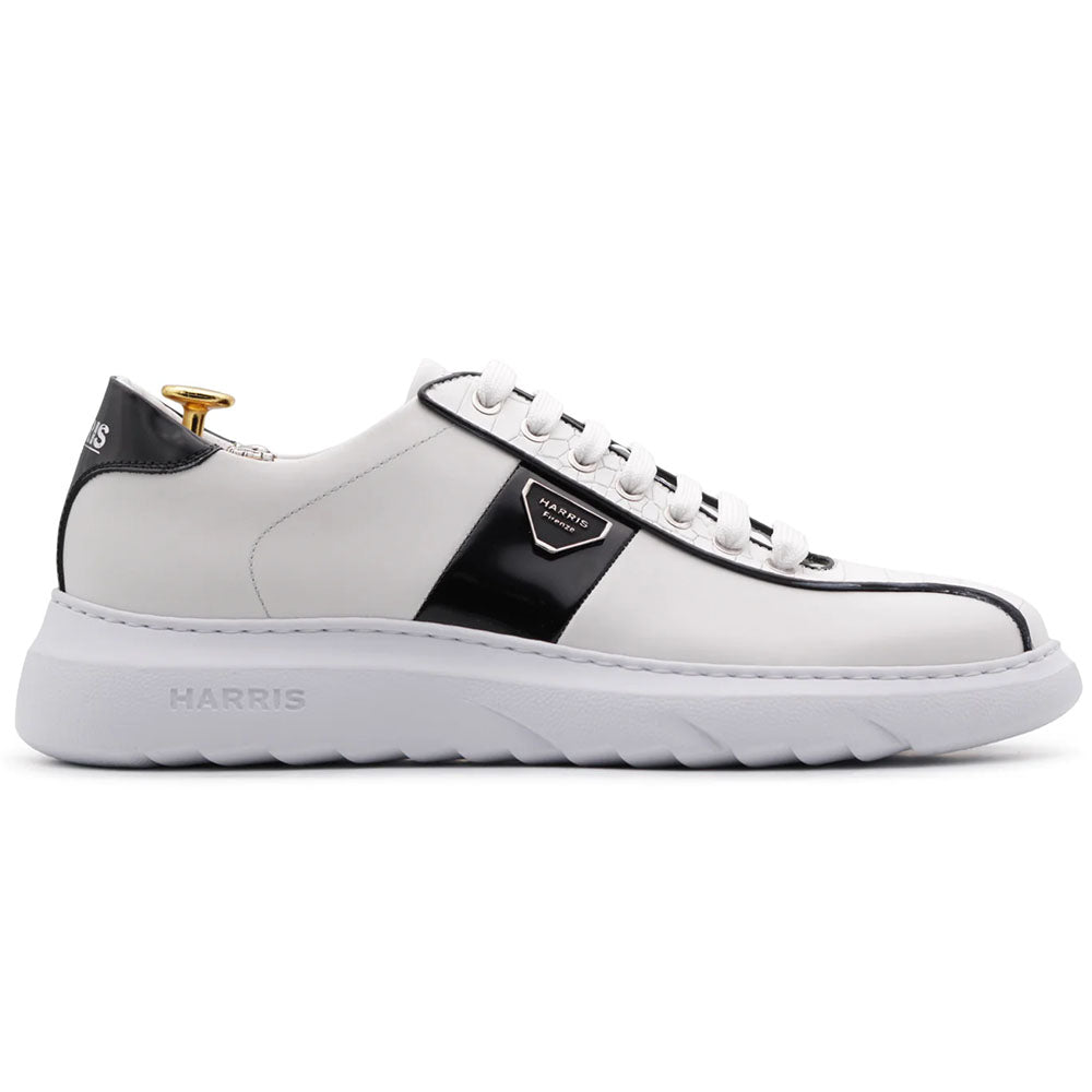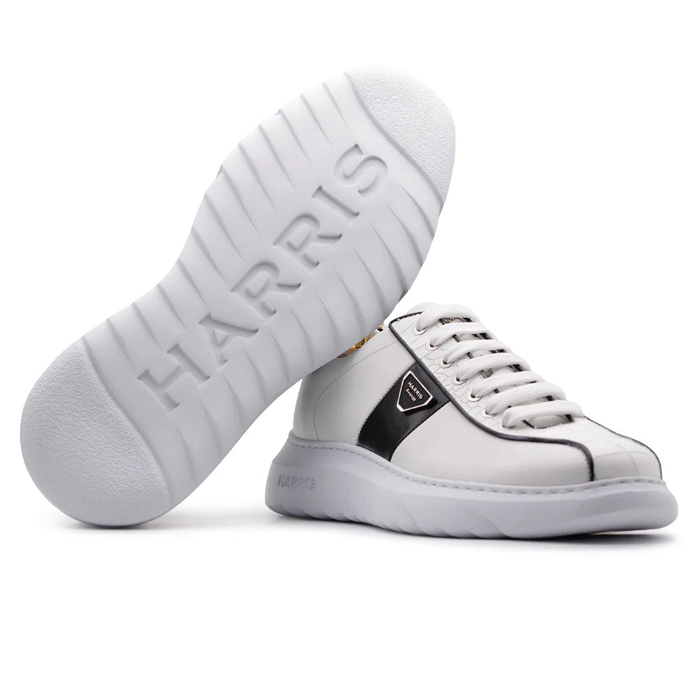 Experience timeless Italian craftsmanship in the Harris sneaker, expertly made from supple white calfskin with crocodile-effect inserts for a bold, sophisticated edge. Glossy black accents and the signature Harris logo highlight its exclusive design, while the lightweight Innovazione rubber sole delivers lasting comfort and flexibility.