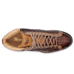 A fusion of materials and masterful craftsmanship, this sneaker combines tobacco suede with perforated beige leather and hand-smudged elk-effect accents for a worn-in yet sophisticated aesthetic. Finished with a distressed Vintage box sole and gold Harris hardware, it embodies a distinctive silhouette that highlights timeless artisanal skill.