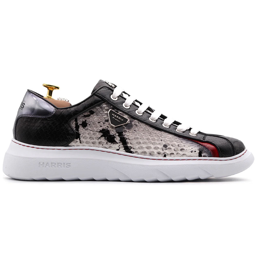 The Harris sneaker is crafted from rock python leather with hand-painted black details, complemented by black python inserts for a bold, sophisticated look. Brushed silver leather accents add brightness and character, while the Innovazione rubber box sole provides comfort and modern style. Harris nickel-finish hardware completes the design with an exclusive touch.