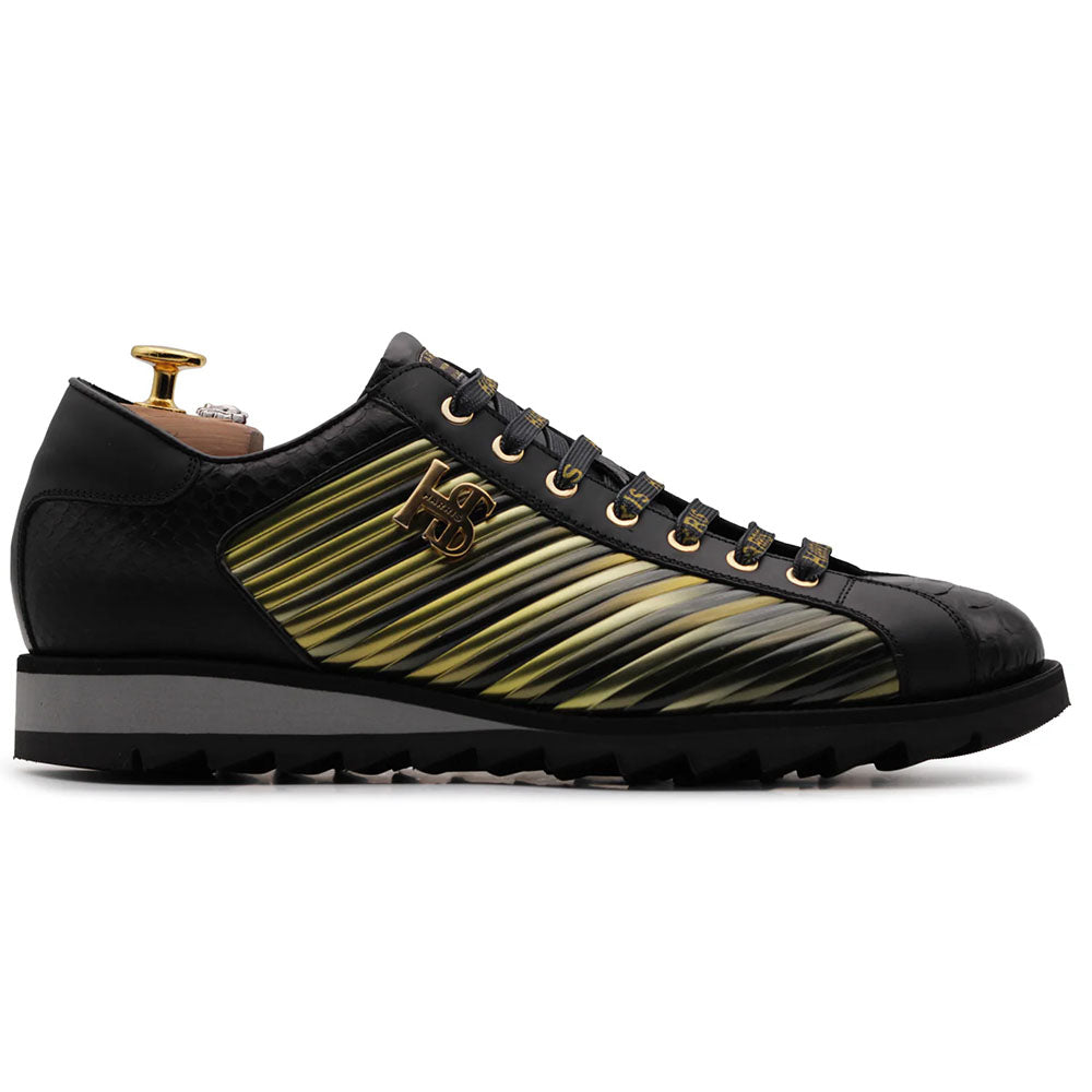 This limited-edition Harris sneaker is crafted from black python leather and accented with brushed leather inserts in an exclusive gold-and-black striped effect for a bold, refined look. Gold-finish accessories add luxurious detail, while the black rubber runner sole provides comfort and modern style.