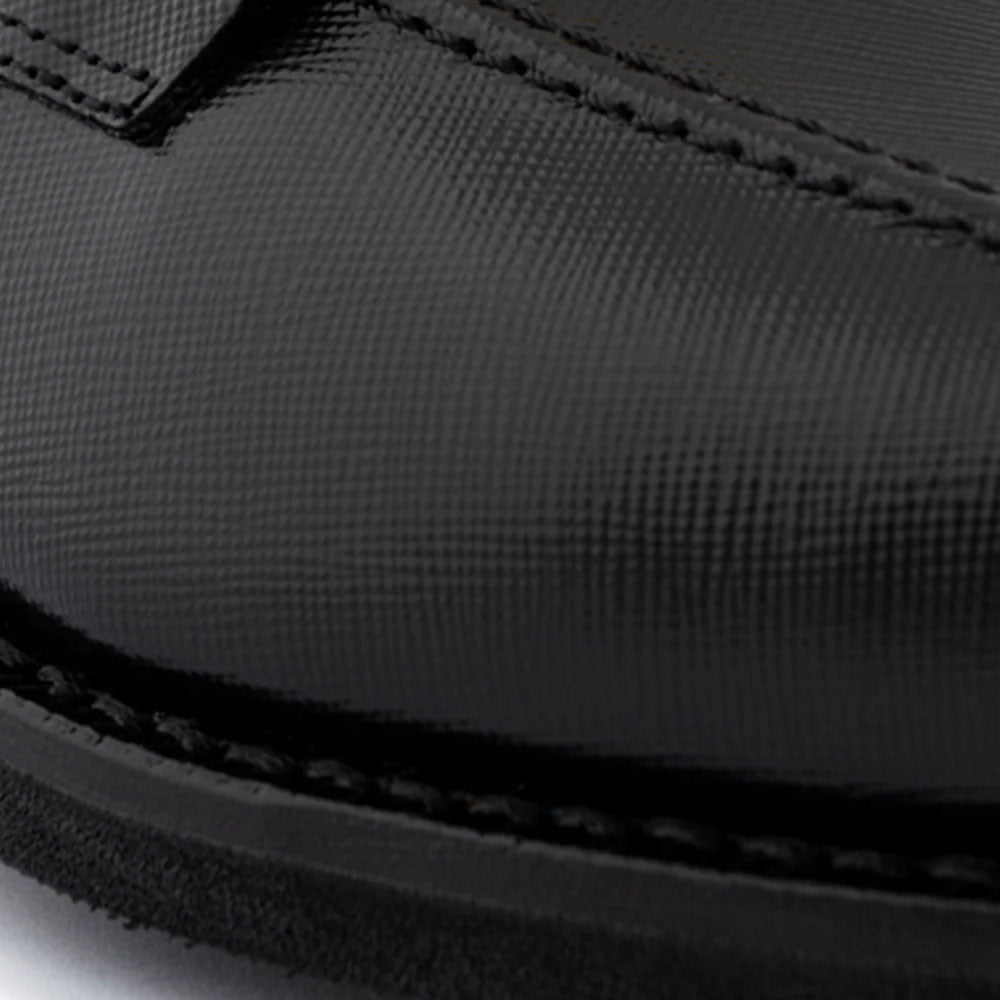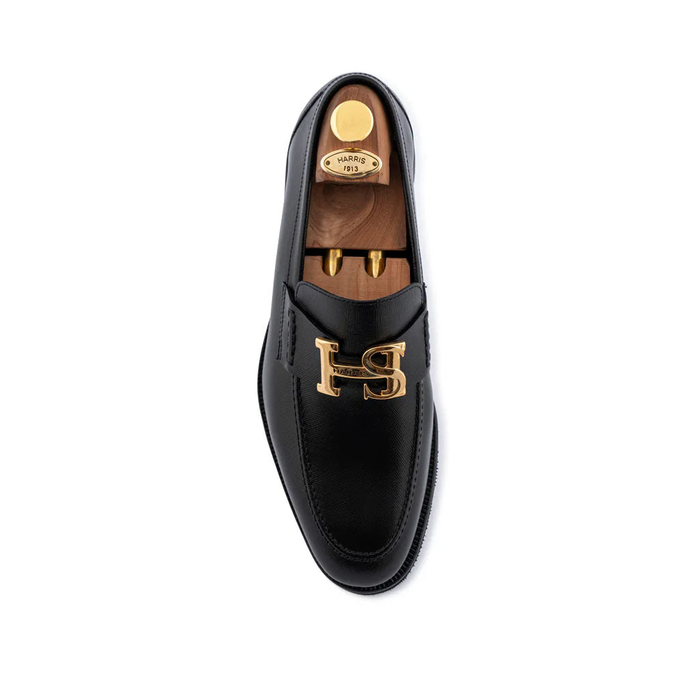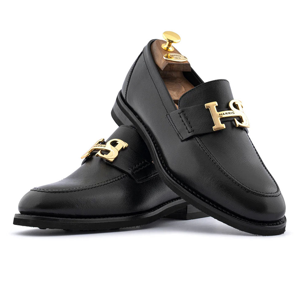 Refined moccasin constructed with the Blake Rapid technique for superior resistance, flexibility, and comfort. Made from fine Saffiano calfskin, it showcases a distinctive textured finish and sophisticated shine. A leather loop with a gold-colored HS accessory adds a touch of elegance and refinement. Completed with a Dainite rubber sole that provides excellent grip and long-lasting durability.