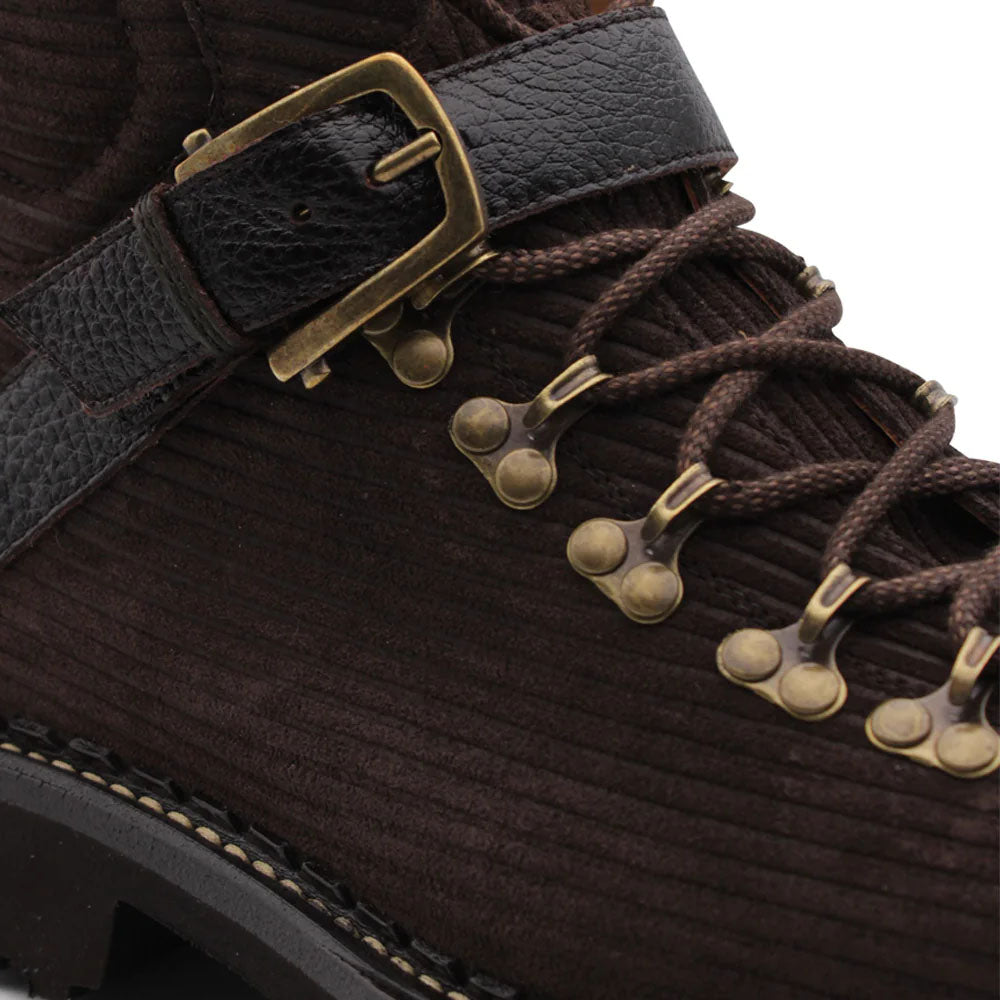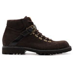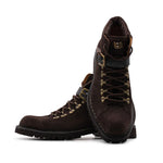 Suede ankle boot in a dark brown “testa di moro” shade with a striped texture, enriched with leather details and a rugged rubber lug sole. The stitched welt and Blake Rapid construction combine true craftsmanship with an outdoor spirit.