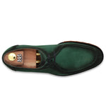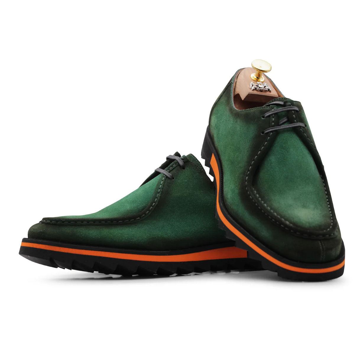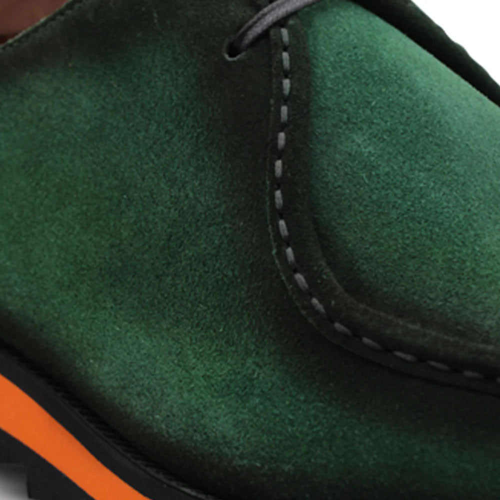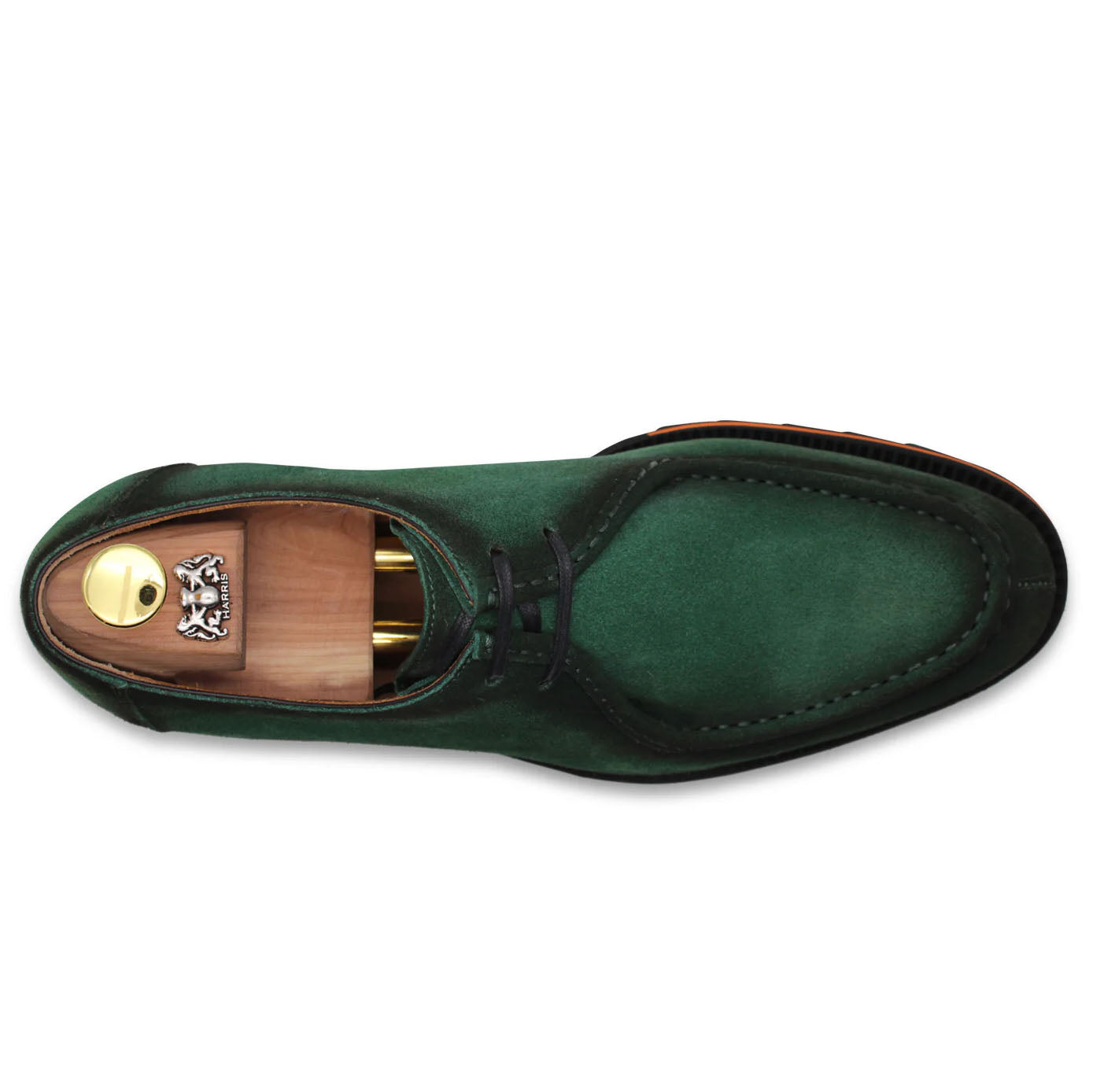 Emerald green suede derby with hand-applied dark shading. The Harris Ripple sole with an orange insert and Blake Rapid construction create an iconic, energetic, and distinctive model.