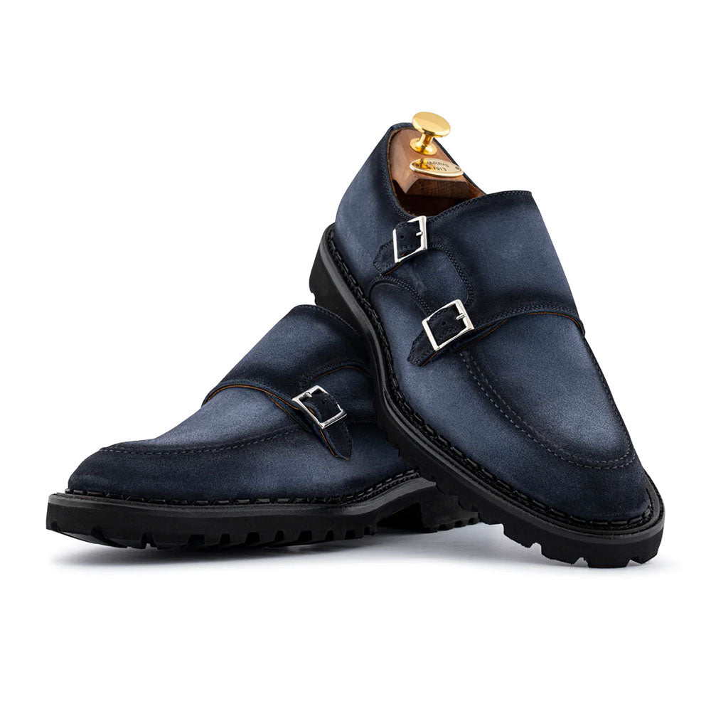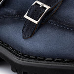 Double-buckle shoe crafted from hand-shaded suede, embodying refined, contemporary style. Edge stitching highlights precise craftsmanship, while the rubber lug sole with stitched welt adds character and durability without compromising elegance.