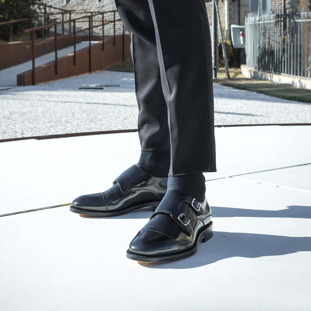 Men’s double-buckle shoe in shiny calfskin with toe stitching and leather sole. Crafted with Goodyear Flex construction for durability and easy resoling, the Aron offers a refined, versatile style suitable for both elegant outfits and casual looks. Comfortable and ideal for work or leisure. Made in Italy.