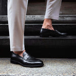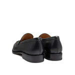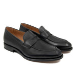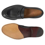 Men’s black loafer crafted from soft, shiny calfskin with a comfortable fit. Featuring Goodyear Flex construction, a leather sole, straight tongue, and double-stitched apron for a casual yet refined look. Perfect for everyday wear with a sport coat or tailored attire. Made in Italy.