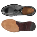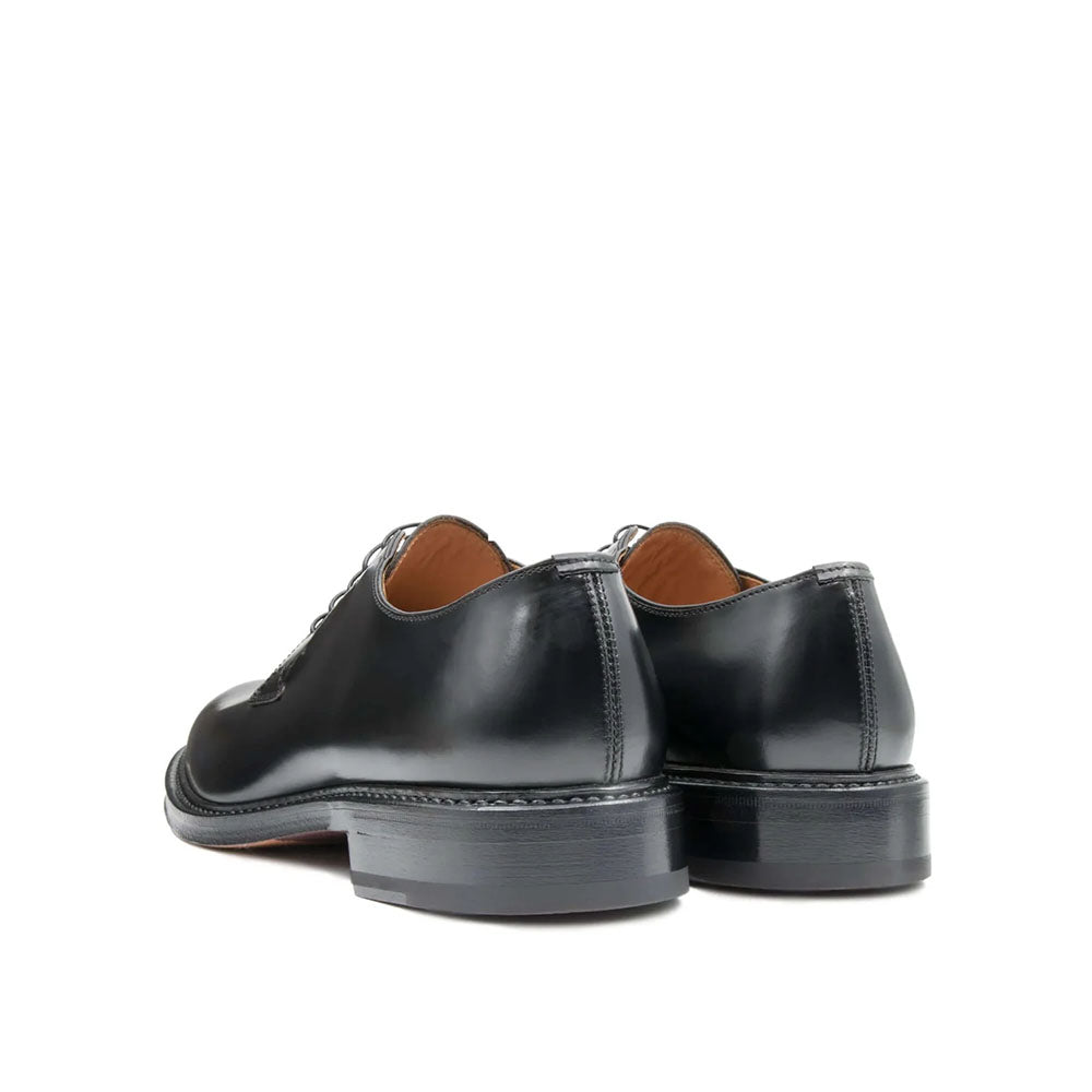 The Counselor is a classic men's lace-up shoe in traditional English style, ideal for both work and leisure. Crafted from soft shiny calfskin, it features derby lacing, a buffalo leather sole, and a comfortable rounded toe with hand stitching on the cuff and half-moon on the eyestay. Constructed with Goodyear welted craftsmanship, it ensures durability and can be easily resoled. Made in Italy.