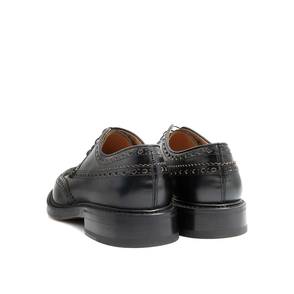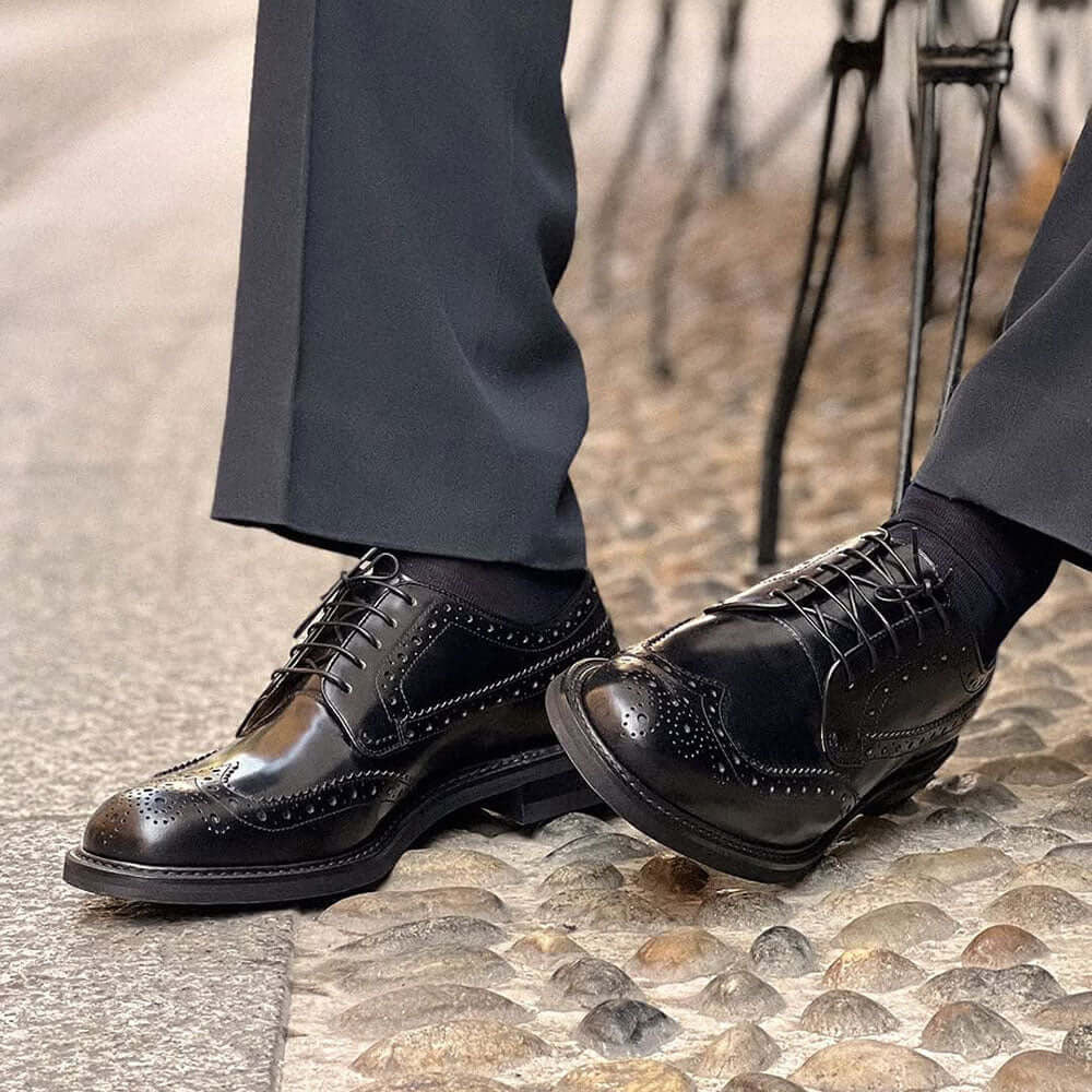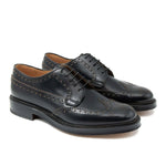 Classic men's lace-up Derby crafted from soft black calf leather with a buffalo leather sole. Handcrafted with Goodyear Welted construction and detailed with brogue accents and floral perforations on the toe, it blends English elegance with everyday versatility. Perfect for both casual and formal wear. Made in Italy.