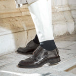 Classic men's lace-up Derby crafted from soft black calf leather with a buffalo leather sole. Handcrafted with Goodyear Welted construction and detailed with brogue accents and floral perforations on the toe, it blends English elegance with everyday versatility. Perfect for both casual and formal wear. Made in Italy.