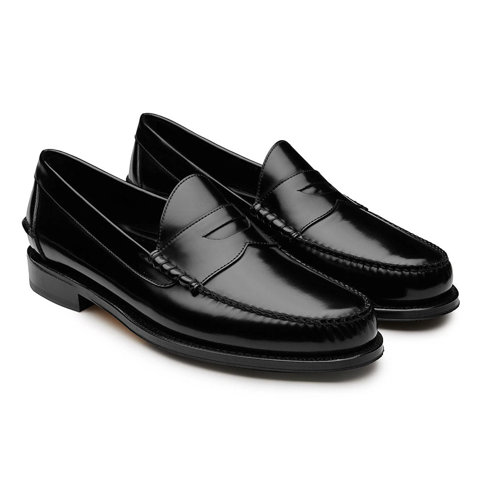 Men’s black leather loafers crafted from premium European calfskin with a sleek, hand-finished design. Built with Kiowa construction for exceptional flexibility and comfort, they feature a soft lamb leather lining, cushioned insole, and a flexible non-slip leather sole with a rubber-inserted heel. Refined and versatile, these loafers pair effortlessly with both formal and casual attire.