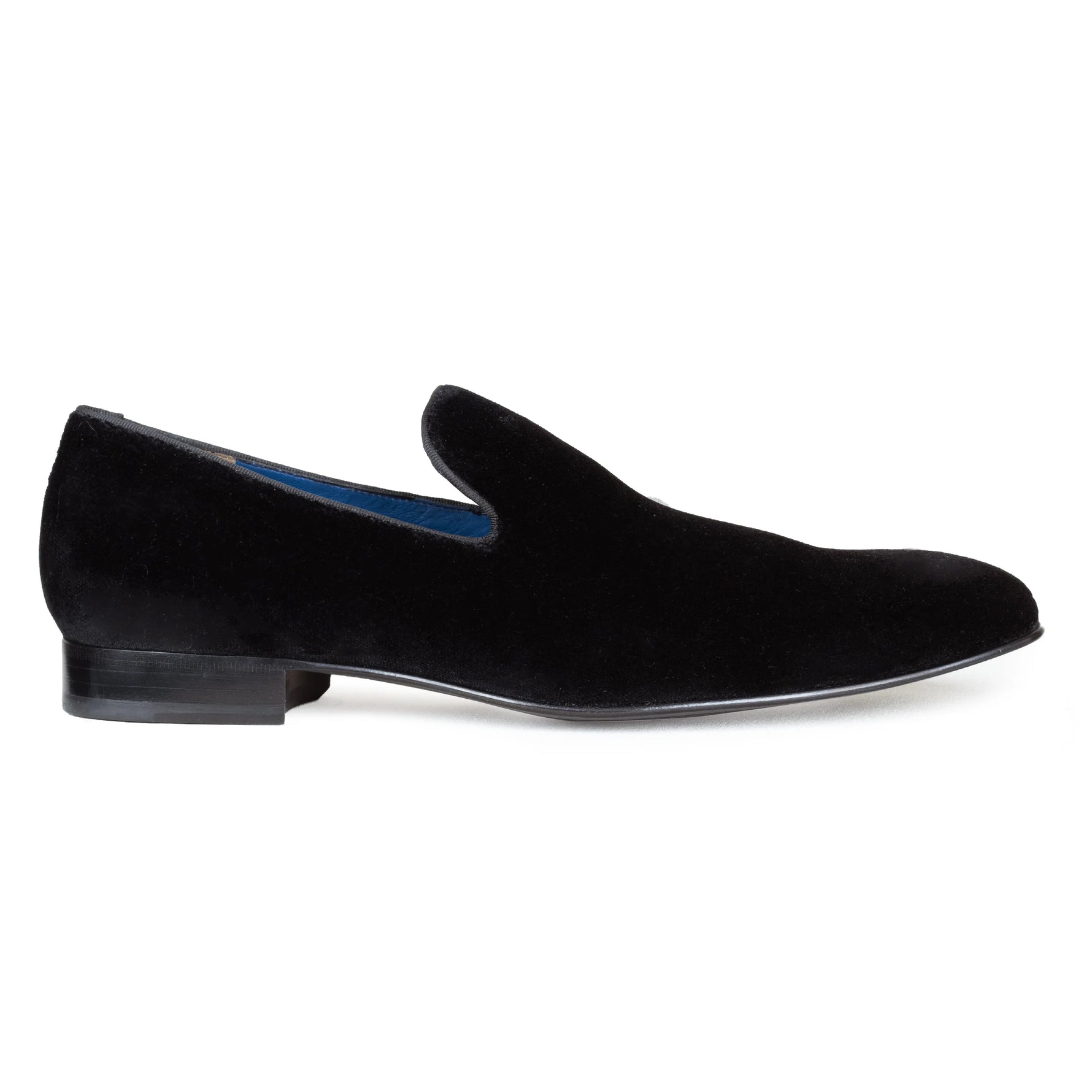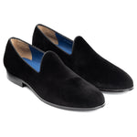 Men’s black velvet tuxedo slip-on loafers crafted with a velvet and European calf leather upper and soft cowhide leather lining. Cemented construction with flexible inner padding and a leather sole ensures lightweight comfort and a refined fit. Elegant and versatile, these loafers elevate formal attire with understated luxury.