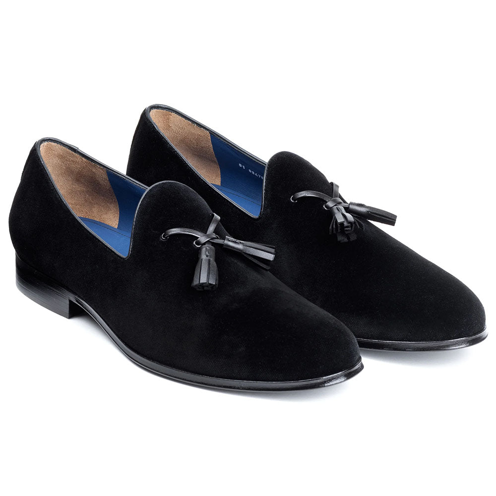 Men’s black velvet tuxedo slip-on loafers crafted with a velvet and European calf leather upper and soft cowhide leather lining. Cemented construction with flexible inner padding and a leather sole ensures lightweight comfort and a refined fit. Elegant and versatile, these loafers elevate formal attire with understated luxury.