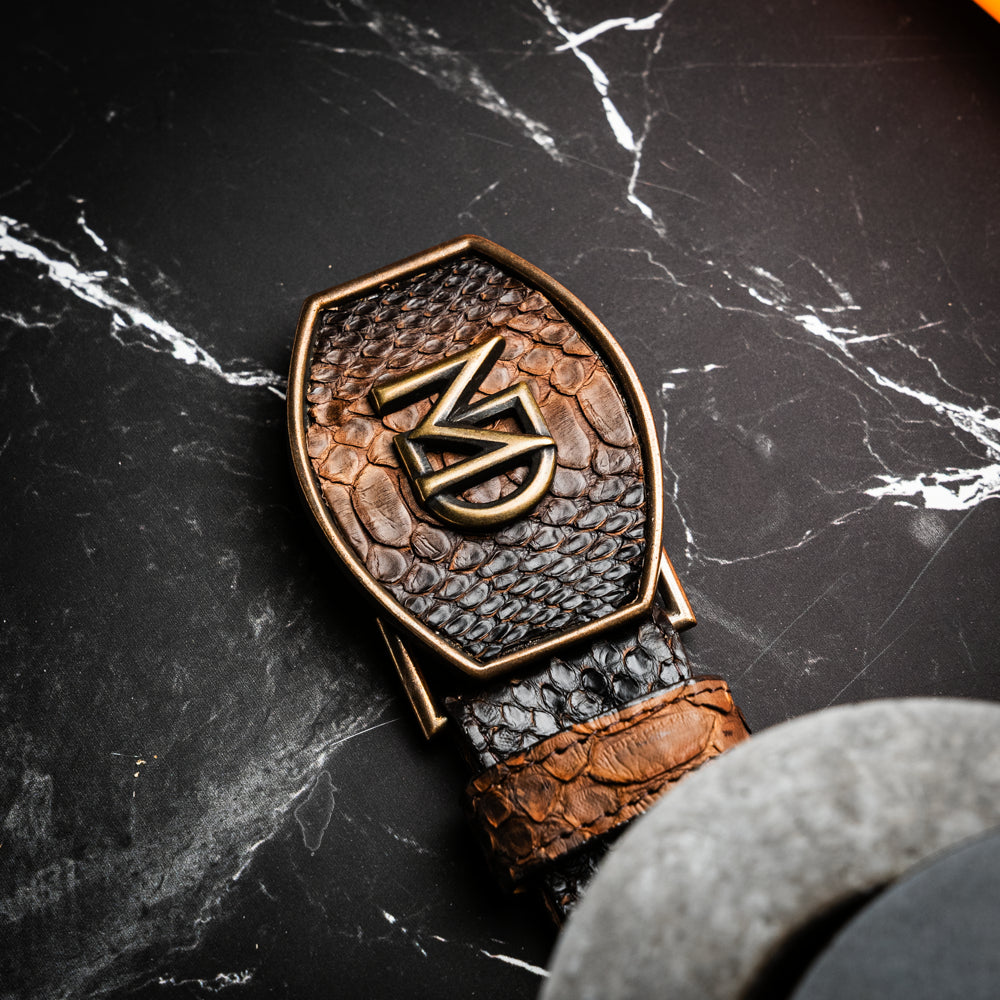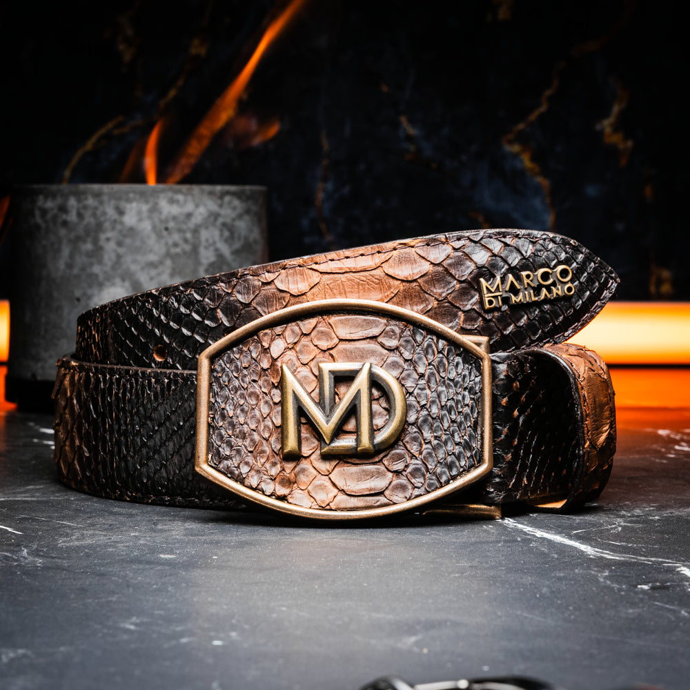 The Arkansas by Marco Di Milano is a bold, 1.75-inch belt crafted from genuine python for a refined yet rugged appeal. Meticulously constructed for those with a taste for distinction, it features a prominent buckle showcasing the signature Marco Di Milano emblem in antique-finished metal. A statement piece that balances luxury with edge, the Arkansas is designed to elevate both tailored and casual looks.