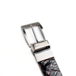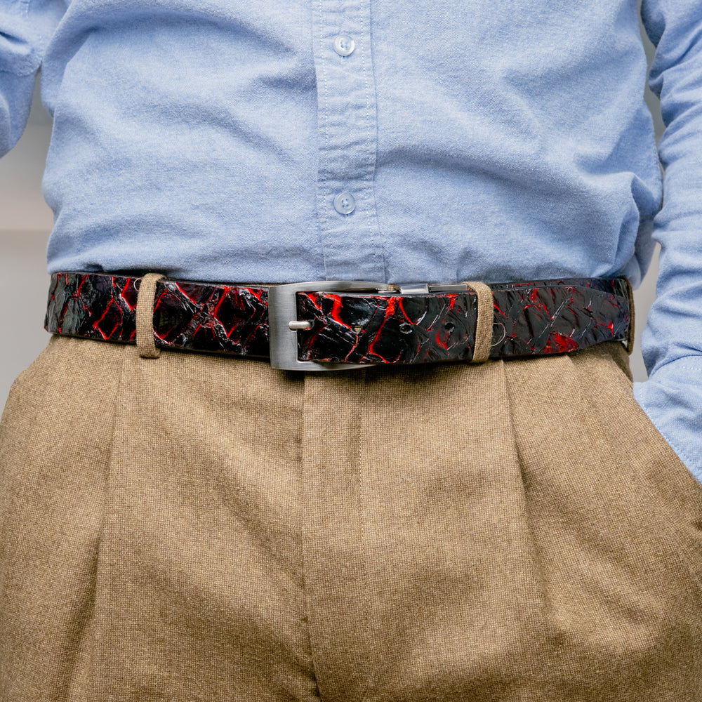 Genuine and stunning authentic pirarucu belt with a burnshed finish, a branded Marco Di Milano brushed silver buckle, and soft interor lining.