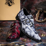 The Mauri 44166/2 Alligator Buckle Derby is a luxurious lace-up crafted from genuine alligator leather in a rich finish. It features a bold gold-tone buckle detail across the vamp, adding a statement touch to its refined silhouette. The pointed toe and sleek lines emphasize elegance, while the sturdy leather sole ensures durability and structure. This design blends exotic materials with standout detailing, making it a striking choice for elevated, fashion-forward style.