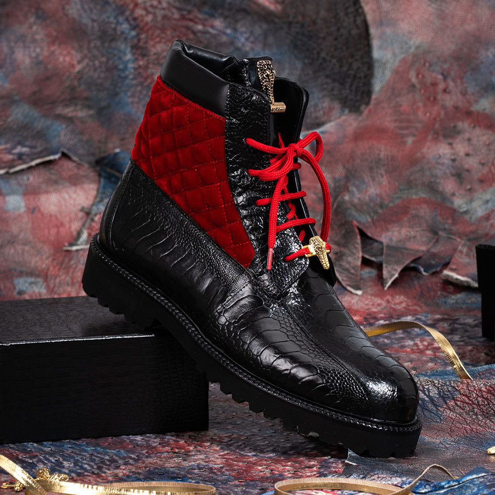 Mauri 4949/4 Ostrich Leg & Quilted Velvet Lace Up Boot Black / Red