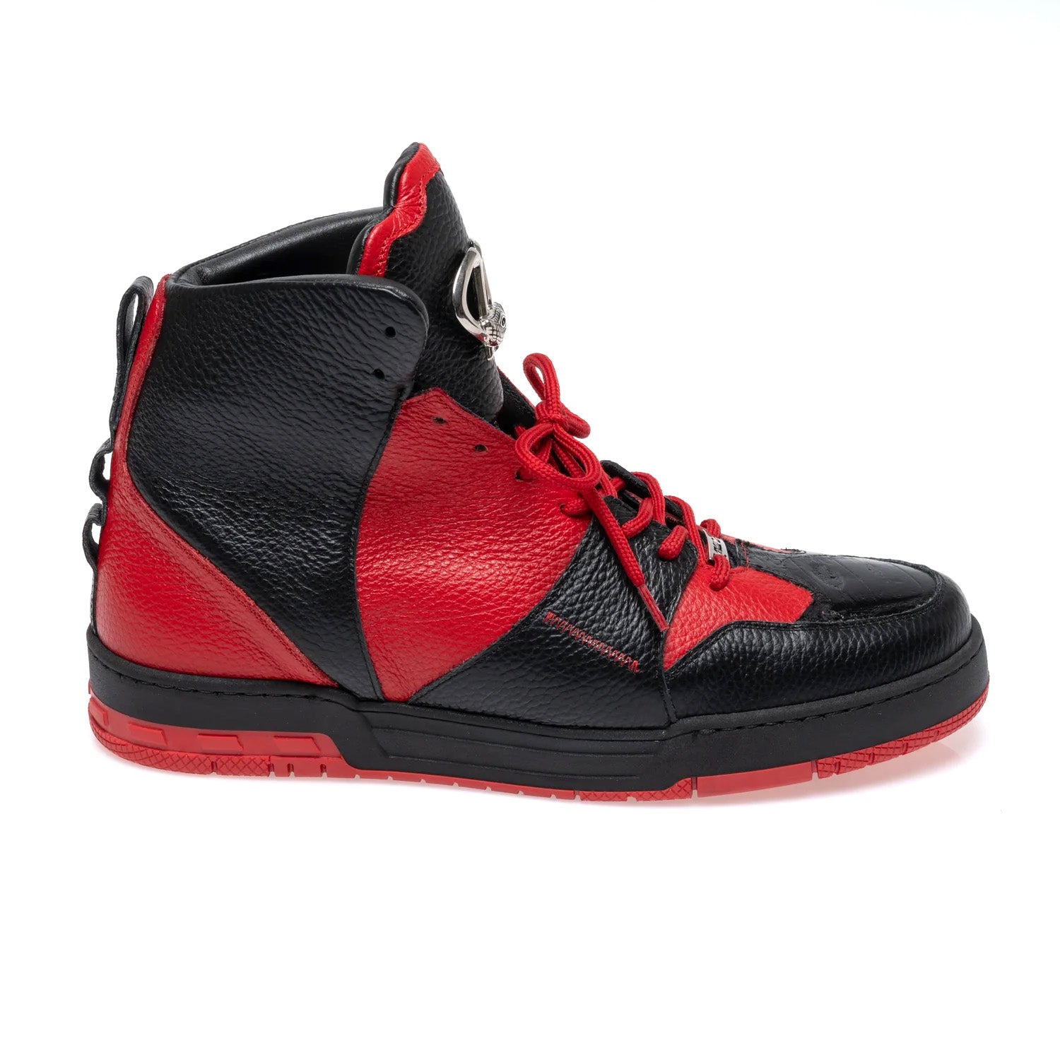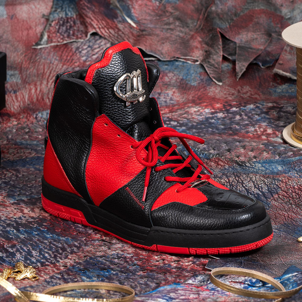 The Mauri 8471 Time & Baby Crocodile sneakers feature a striking combination of black and red, crafted from premium leather and baby crocodile for a bold, textured look. Expert craftsmanship highlights the luxurious materials, while a flexible rubber sole ensures comfort and everyday wearability. This dynamic design blends contemporary style with refined elegance.