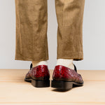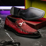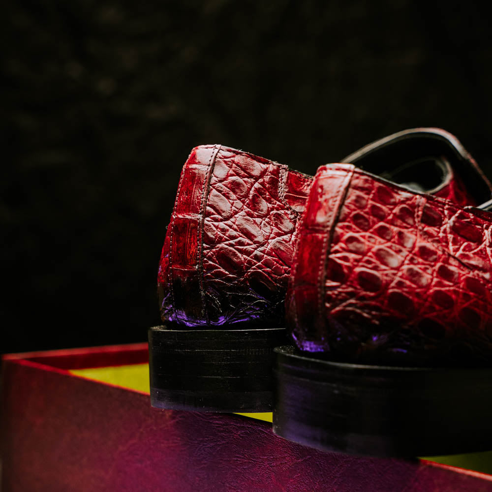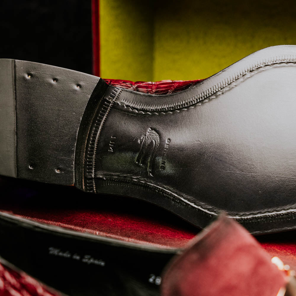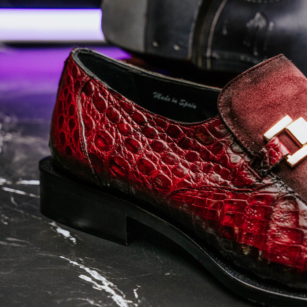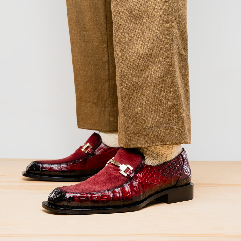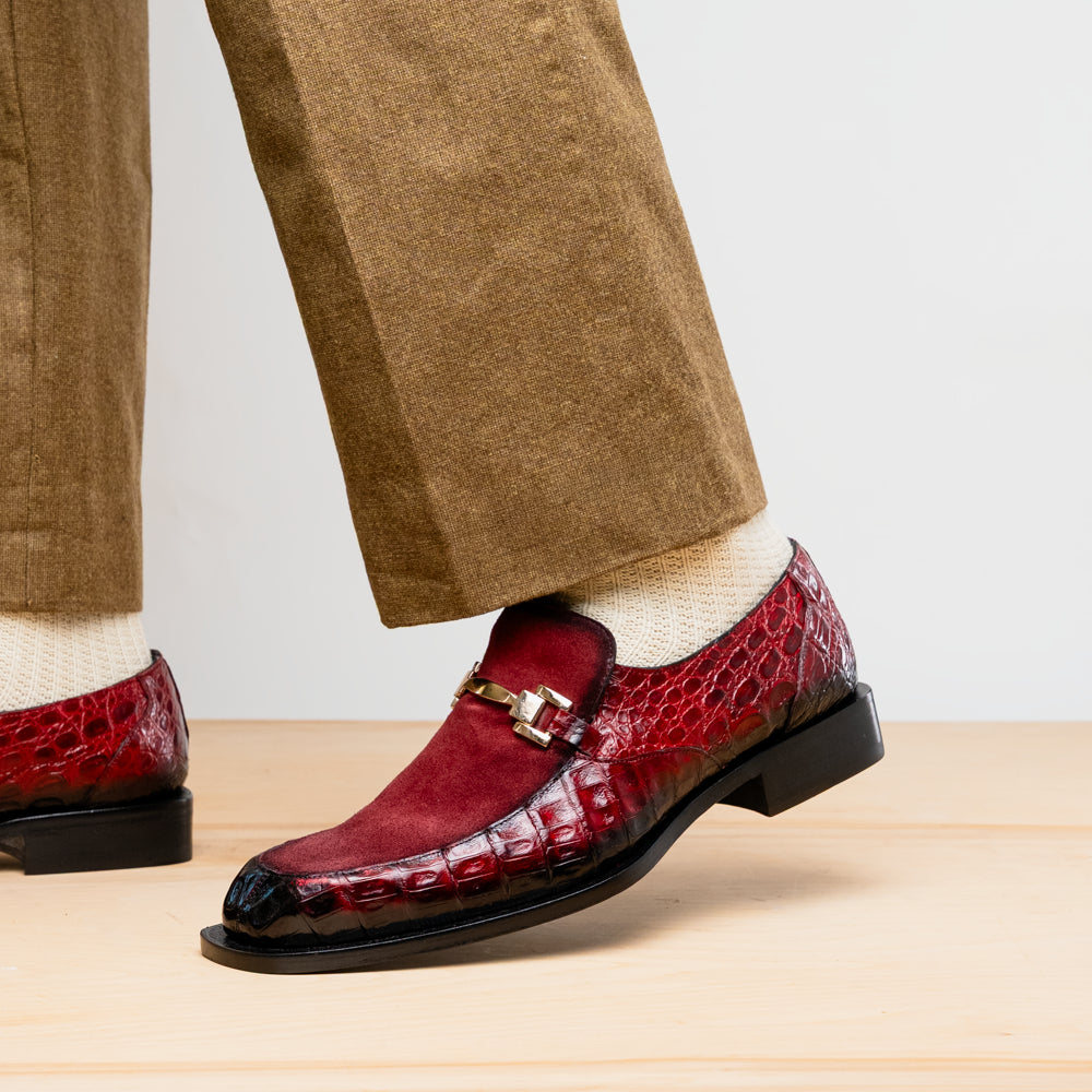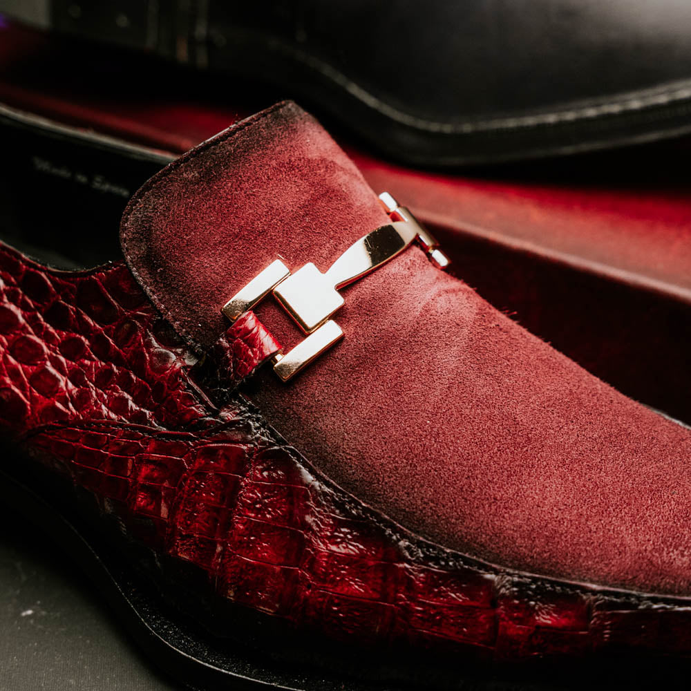 The Mezlan Accola is an exclusive slip-on loafer crafted from genuine crocodile leather and rich suede, showcasing a striking interplay of texture and luxury. Presented in a deep burgundy finish, it exudes refined sophistication with a bold edge. A polished metal bit detail across the vamp adds a touch of modern elegance, while the hand-burnished crocodile leather enhances its distinctive character. Finished with a leather sole, the Accola combines timeless craftsmanship with contemporary style, making it a true statement piece for the discerning gentleman.