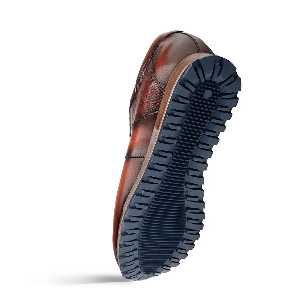 A luxurious men’s sneaker crafted from genuine lizard and burnished calfskin. The hand-stained finish and sport-inspired rubber sole combine athletic comfort with refined sophistication. Featuring an injected memory foam insole for exceptional cushioning. Handmade in Spain.