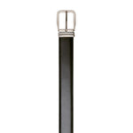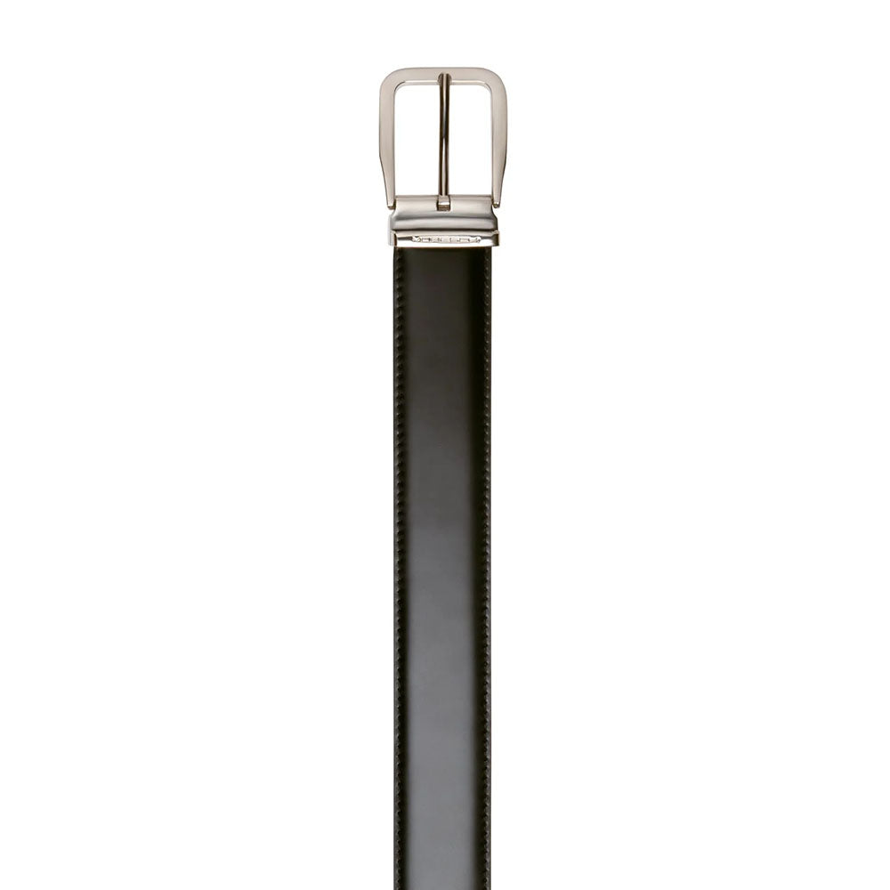 Men’s stitched belt in durable black calfskin, 35 mm wide. Its timeless design and pointed tip make it an essential accessory for both professional and casual looks. Finished with a rounded polished silver buckle and signature Moreschi metal keeper for a refined touch. Pairs perfectly with classic models like the Norwich penny loafer, Brussels loafer, or Edinburgh Oxford.