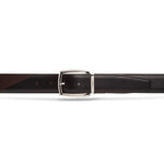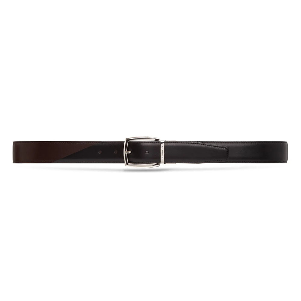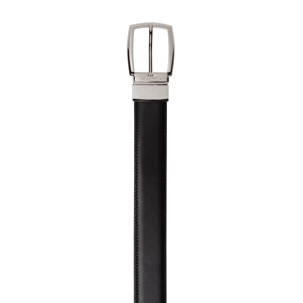 Reversible stitched men’s belt in soft calfskin, 35 mm wide, featuring classic black and dark brown sides. The pointed tip and refined design make it a versatile essential for any outfit. Completed with a faceted polished silver reversible buckle and signature Moreschi metal keeper for a contemporary, elegant touch. Perfectly pairs with iconic styles like the Stuttgart derby and Dresden loafer.