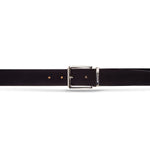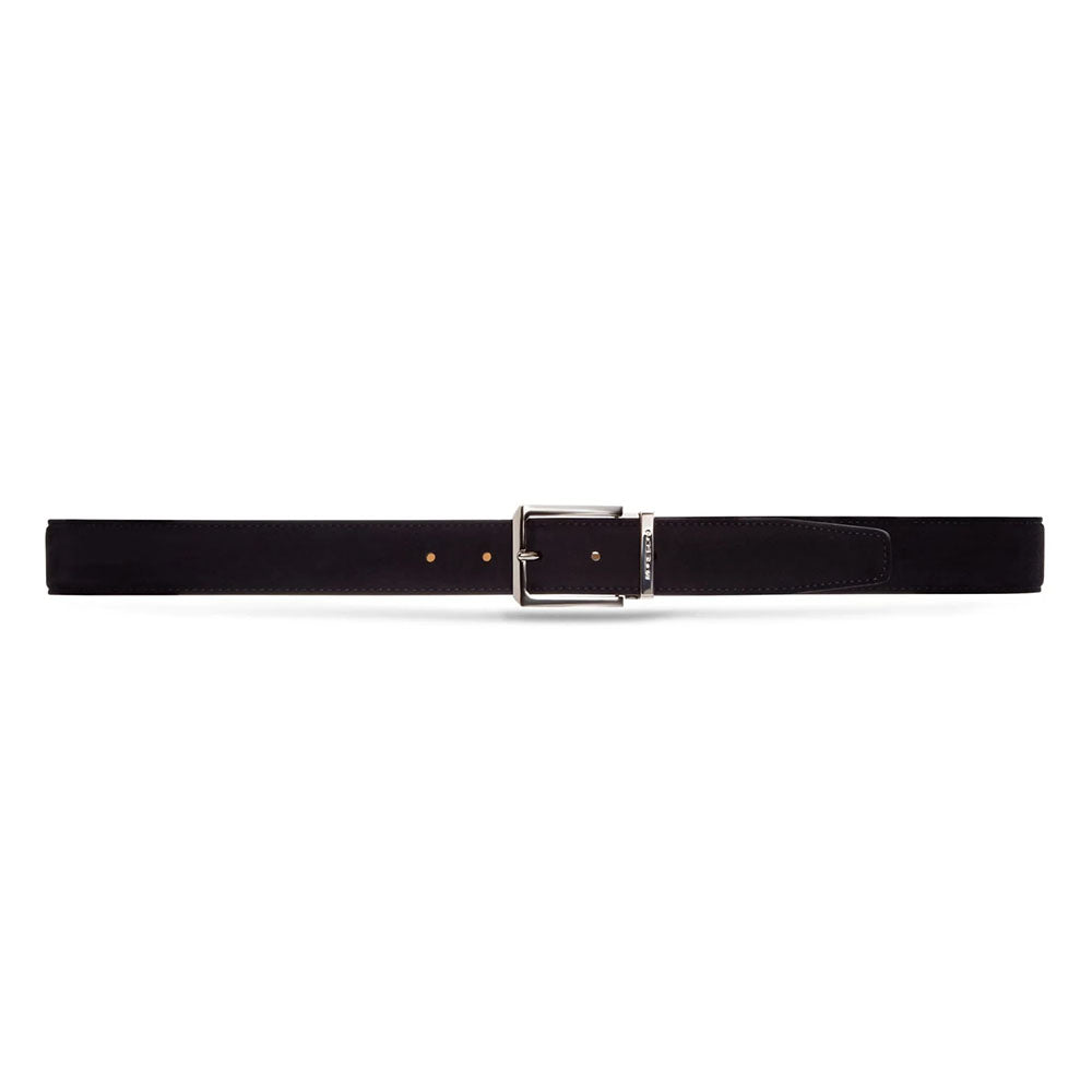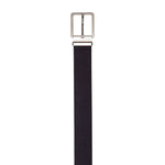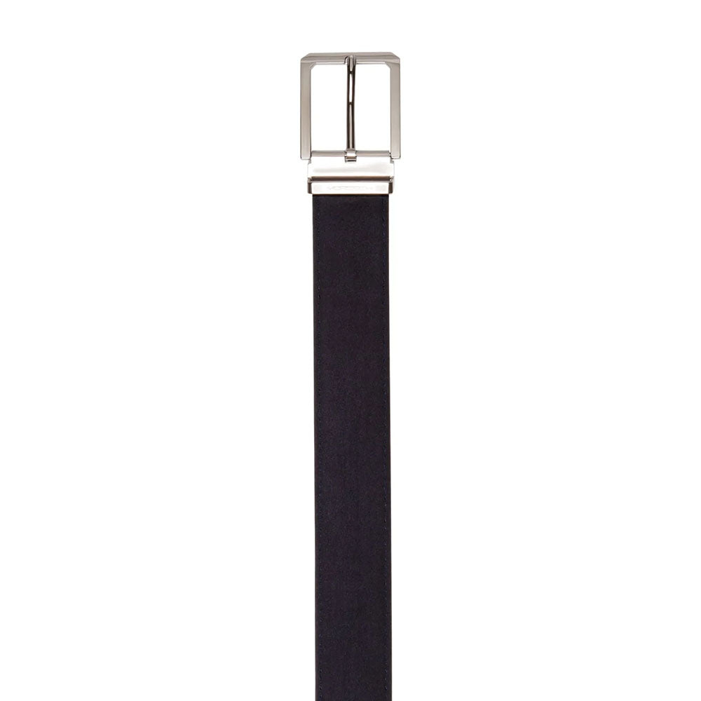 Men’s stitched belt in soft suede calfskin, 35 mm wide, available in dark blue and dark brown. The pointed tip adds a bold, sporty character while maintaining contemporary elegance. Features a polished silver square buckle with signature Moreschi metal keeper. Ideal for pairing with the brand’s suede footwear, like the Colonia loafer or Bruges Oxford, to complete a refined casual look.