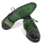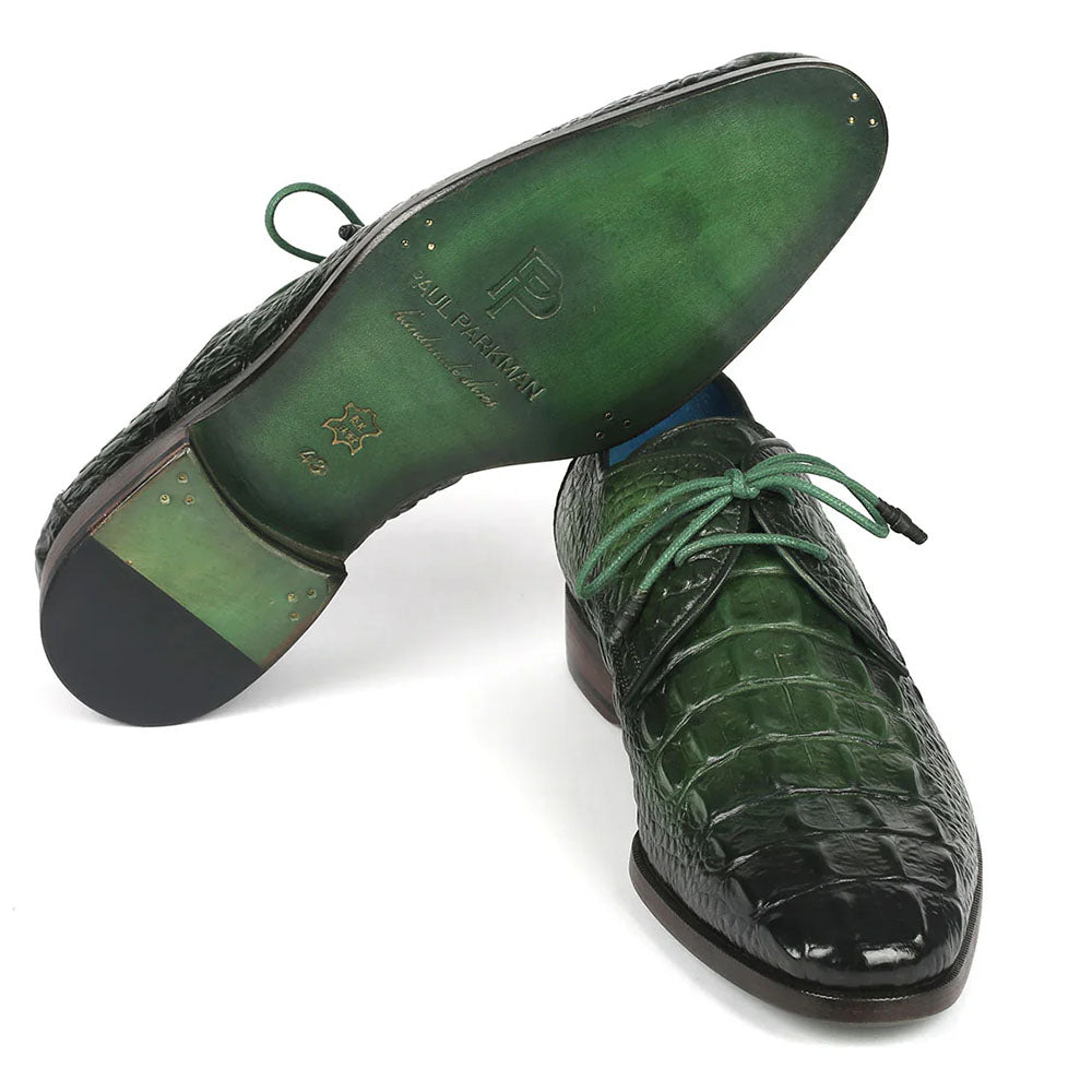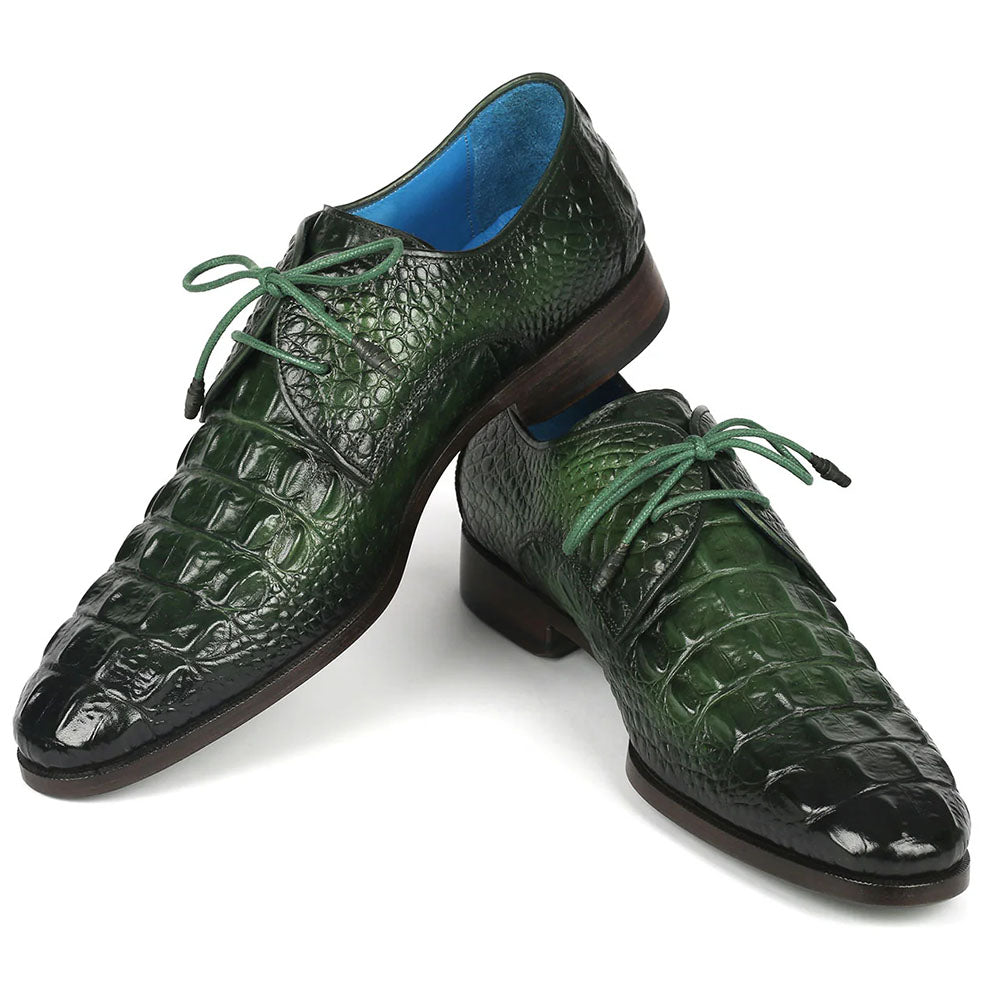 Awesome hand-painted croco textured leather derby shoes from Paul Parkman featuring full leather sole leather lining and insole. Paul Parkman style number 1438GRN.