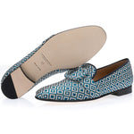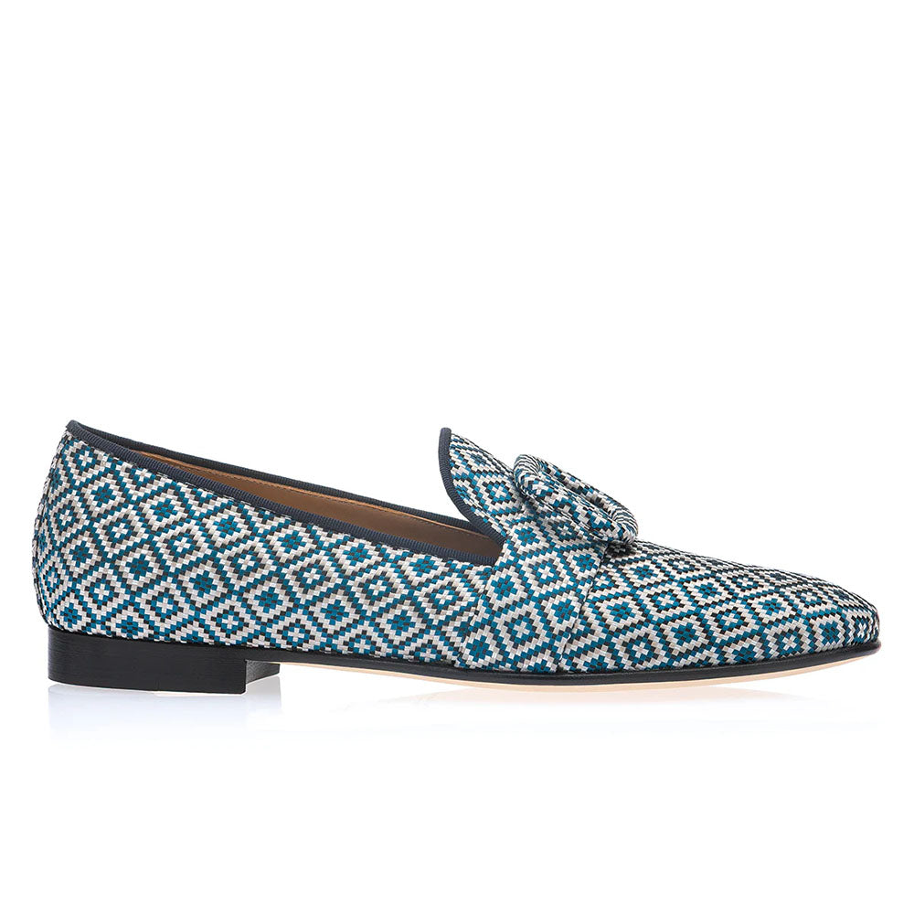 These blue jacquard canvas slippers, handcrafted in Vigevano, Italy, blend classic elegance with modern flair. Featuring fabric-wrapped oversized buckles, soft calfskin lining, and premium leather soles, they offer exceptional comfort and refinement. Perfect for formal occasions, they make a distinctive statement of Italian craftsmanship and contemporary style.
