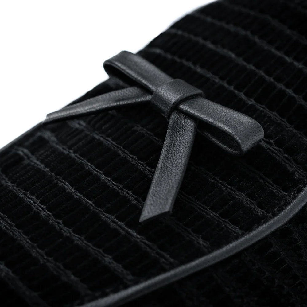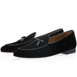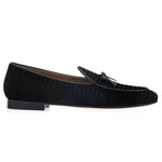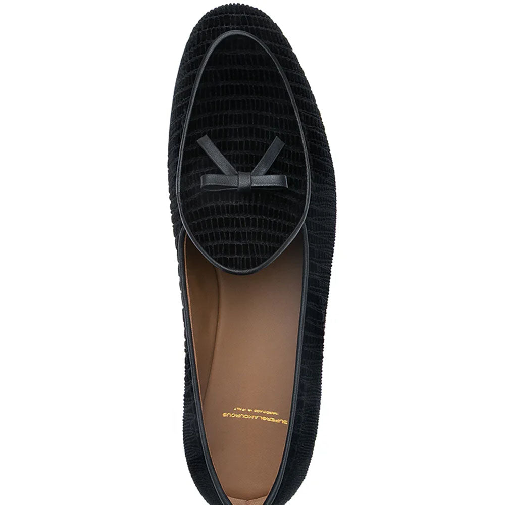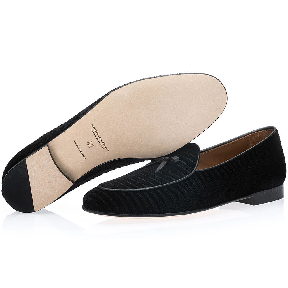 Elegant black velvet Belgian loafers with tone-on-tone embroidered texture, calfskin piping, and a handcrafted bow. Made in Vigevano, Italy using traditional sacchetto construction for exceptional comfort, with a full calfskin lining and leather sole. A refined choice for black-tie and formal evening wear.