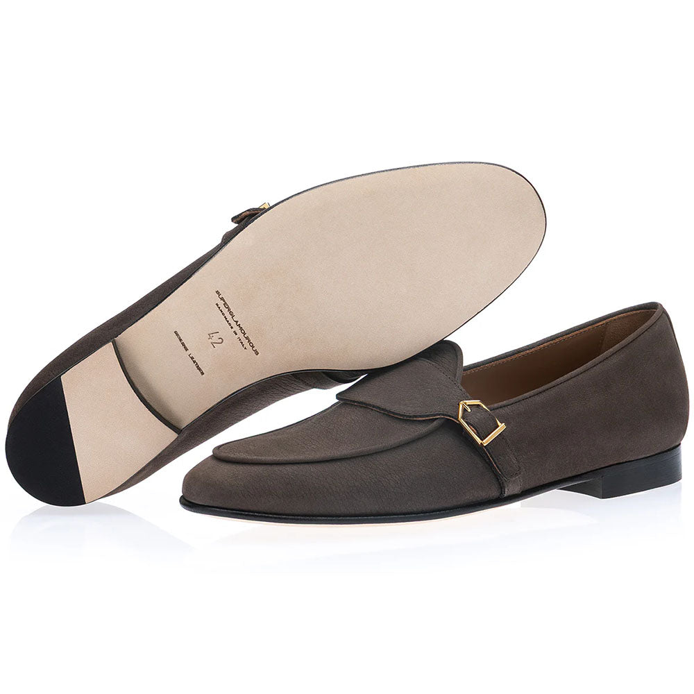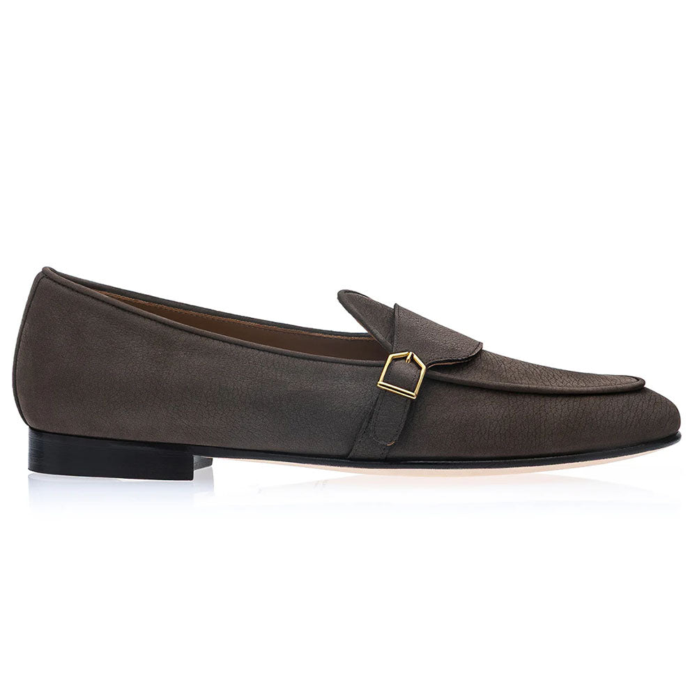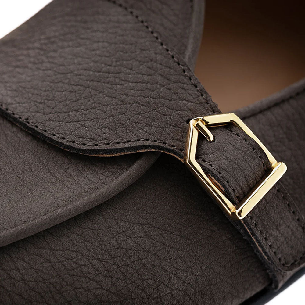 A refined take on seasonal style, these dark brown grainy nubuck Belgian loafers reimagine the iconic Tangerine 15 silhouette with warmth and depth. Featuring tonal piping and gold-finish metal buckles, the single-monk design adds a bold modern twist to a classic profile.