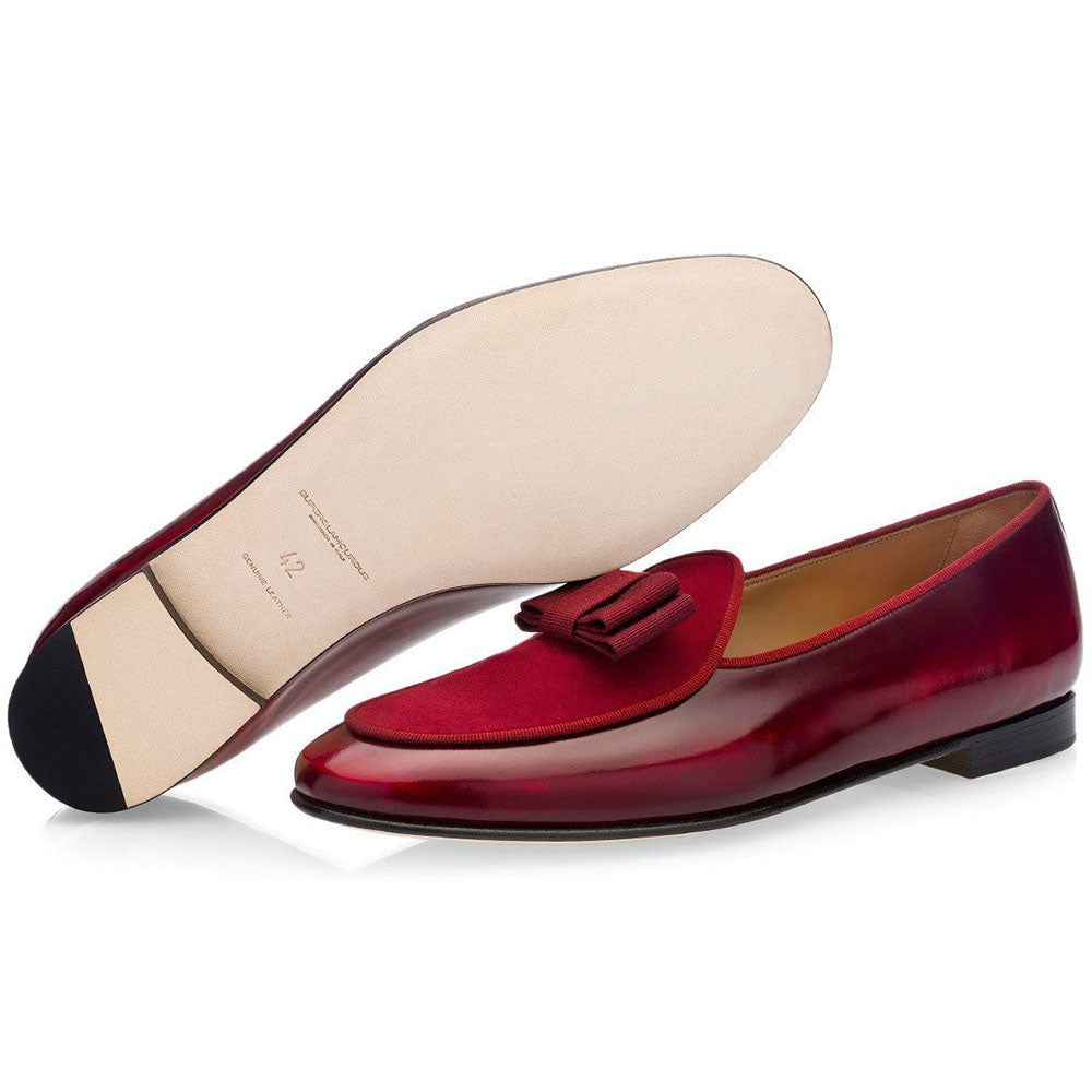 Hand polished calfskin belgian loafers with matching suede inserts. Gros grain piping and silk bow. Constructed with traditional "A Sachetto" technique. Features calfskin lining and leather soles. Handmade in Vigevano Italy.