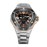 The 8855 Spyder makes a bold debut with its automatic movement and striking mix of stainless steel, black, and rose gold accents. The stainless steel case features black and brown PVD treatment, paired with a sapphire crystal with anti-reflective coating. The retro-inspired dial combines a ground black matte base with intricate brown detailing. Water resistant to 100 meters / 330 ft, this watch blends classic design with contemporary flair.