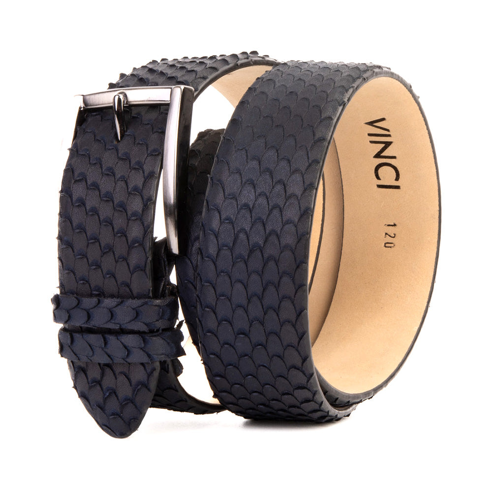 The Majesty Leather Belt is a refined exotic dress accessory handcrafted in Turkey from genuine calfskin leather. Featuring a rich navy-blue leather texture with an intricate scale pattern, it adds depth and sophistication while pairing seamlessly with the Majesty Men’s Sneaker. Finished with a satin nickel buckle and a high-quality full nubuck backing, this 1.5-inch belt delivers lasting comfort, durability, and timeless Vinci Leather craftsmanship.