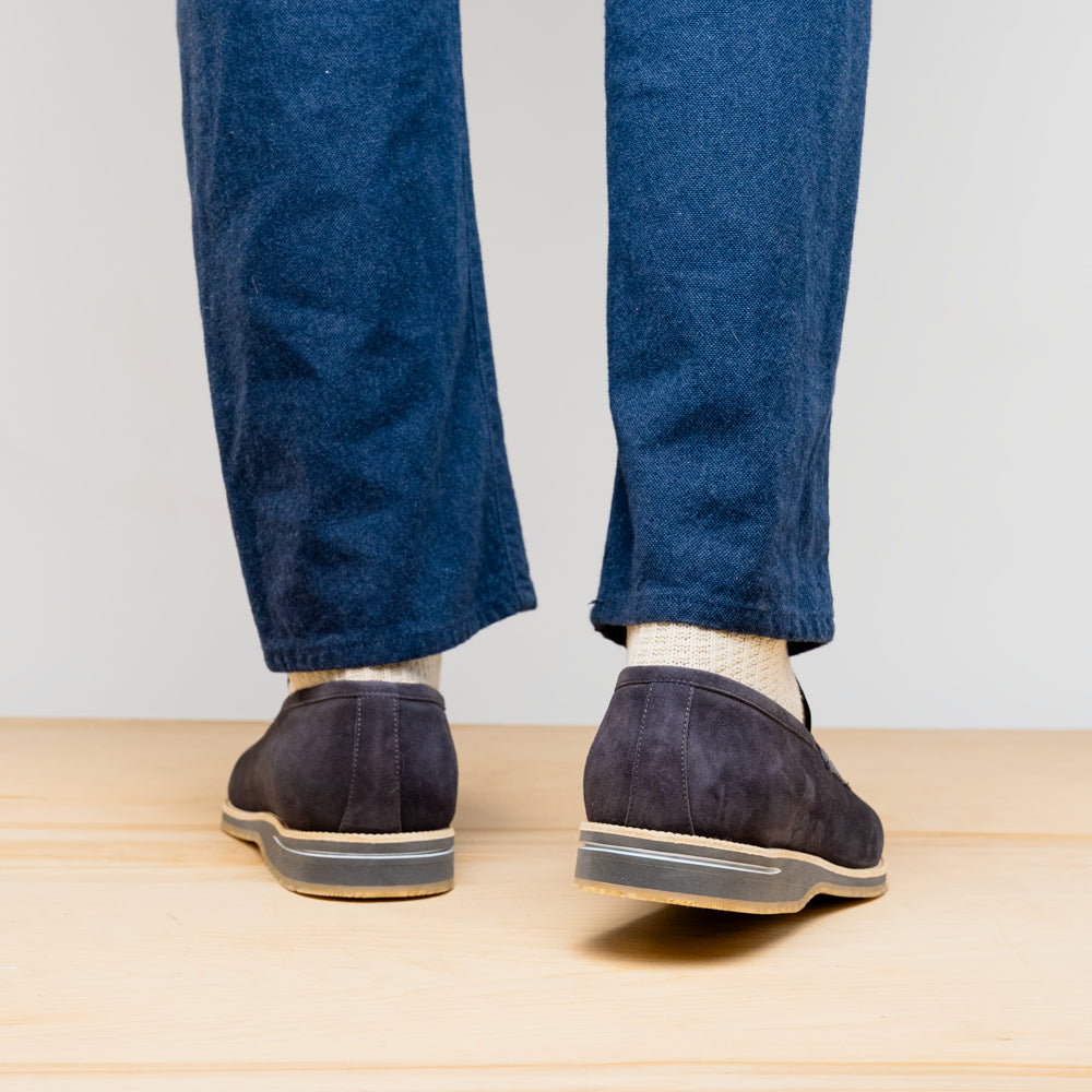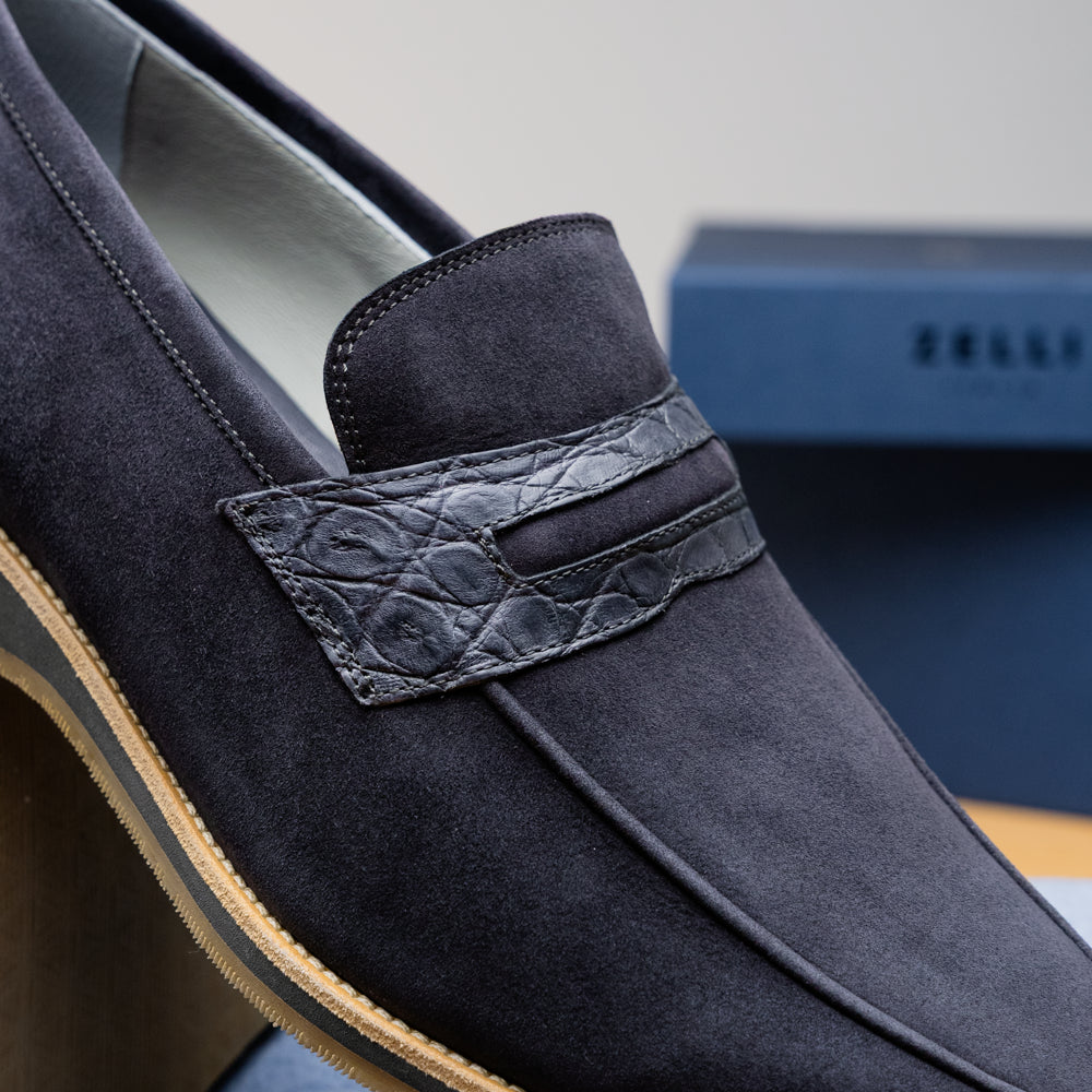 Contemporary suede penny loafers with a modern, light-weight rubber gum sole. The vamp features a genuine crocodile accent that is subtle but bold and classy. Add a touch of progressive style to your casual or dress wardrobe with these unique and versatile shoes. Made in Italy. Zelli SKU 11-035-GRY.